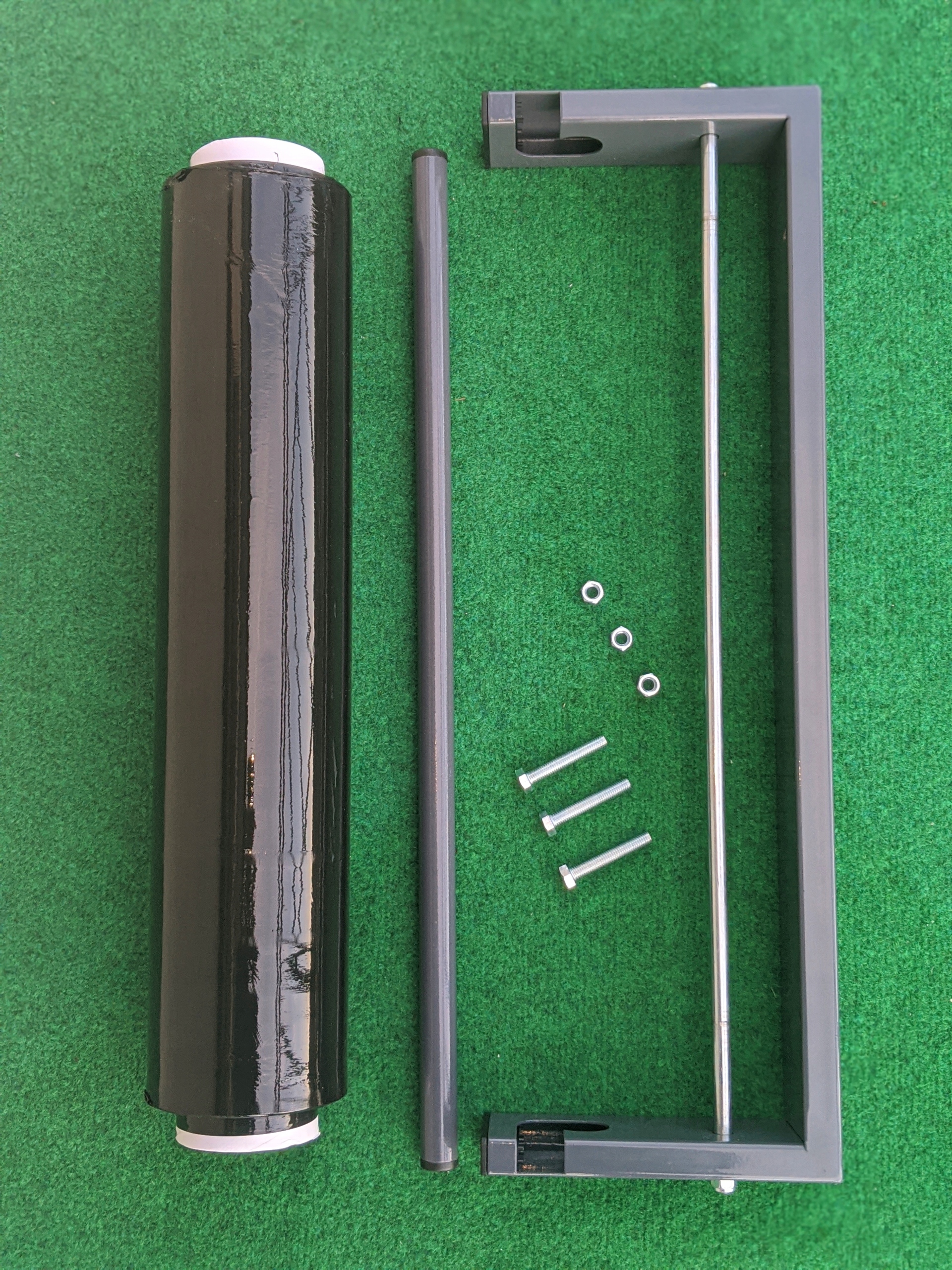 Практичний пристрій для розмотування стретч-плівки, оснащений ручкою, розробленою для стійкого кріплення до стіни або робочої поверхні. Характеризується високою міцністю та стабільністю.