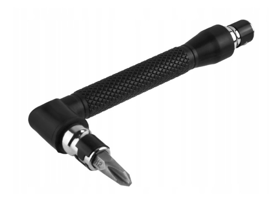 Кутова викрутка YATO YT-04630 на біт 1/4. Незамінний у приміщеннях з обмеженим простором для маневру та в місцях, недоступних для акумуляторних та електричних викруток. Двостороння розетка для наконечника 1/4. Покритий пластиком, що забезпечує надійне захоплення.