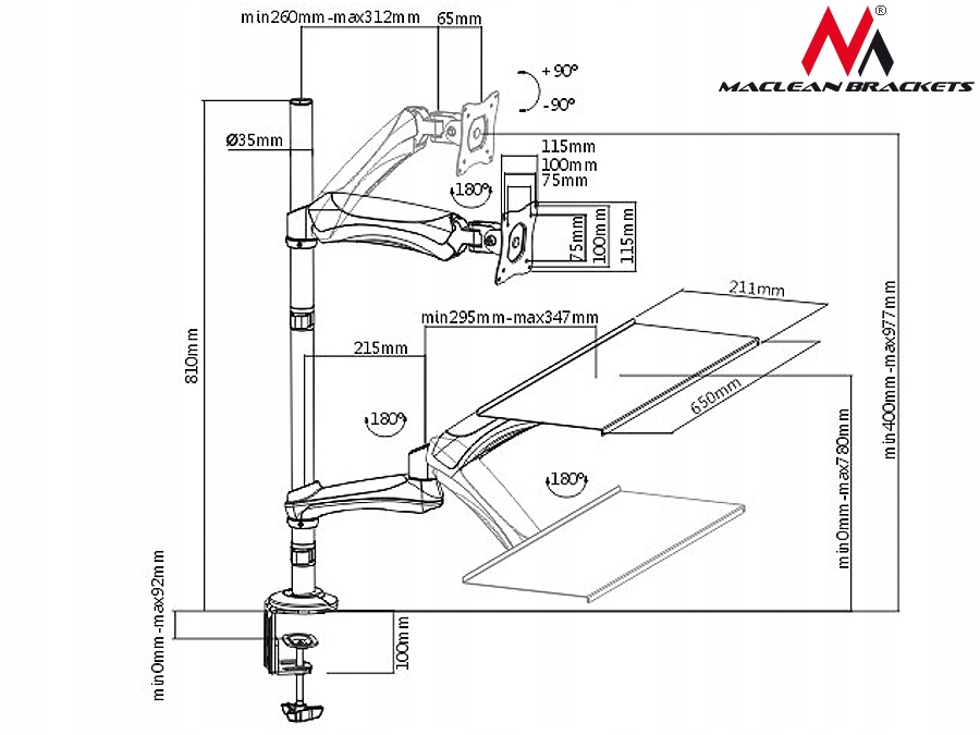 Універсальний тримач для монітора та клавіатури з можливістю кріплення до столу, столу чи отвору для кабелю. Тримач призначений для моніторів з діагоналлю екрана від 13" до 27" і максимальною вагою 9 кг. Тримач виготовлено з металу найвищої якості (комбінація сталі, алюмінію, що формується під тиском, і пластику) чорного кольору, елементи ідеально підібрані, щоб забезпечити стабільну та безпечну опору для монітора та клавіатури.