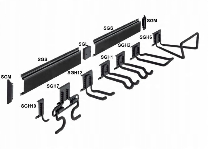 Кожен гачок має спеціальний гачок, що дозволяє швидко монтувати та розбирати. Щоб розширити його, ви можете підключити його за допомогою роз’єму SGL і обробити краї кришками SGM. Вішалки також доступні в нашій пропозиції. Вони виготовлені зі сталі, а елементи, які безпосередньо контактують з підвішеними предметами, мають гумове покриття, яке захищає від подряпин. Доступні розміри і форми вішалок дозволяють зручно зберігати багато інструментів і обладнання так, щоб до них був швидкий доступ. Всі елементи системи GOLIAT доступні в наших продажах.