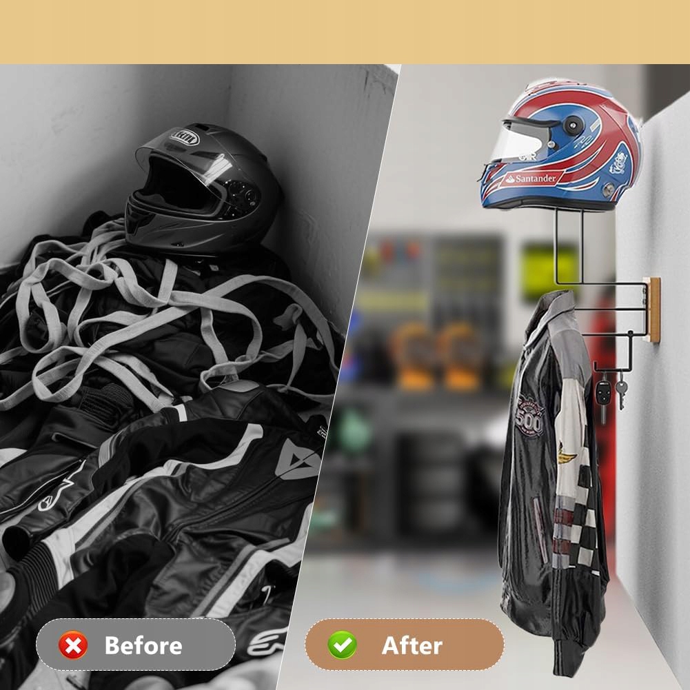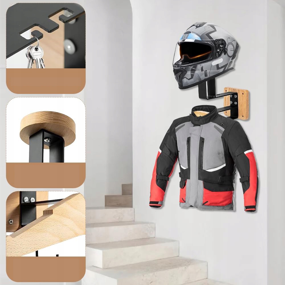 ➡ 【стабільне багаторазове навантаження】: Цей власник стін поєднує 3 системи підтримки в одній конструкції. Масивний тримач шоломів з дерева (вантажопідйомність: 10 кг) захищає мотоцикл та спортивні шоломи від подряпин. Підсилений власник жилета (вантажопідйомність: 20 кг) забезпечує безпечне утримання важких захисних жилетів та футбольних сорочок. Власник ременя (ємність навантаження: 10 кг) забезпечує легкий доступ до ременя та велосипедних клавіш.
