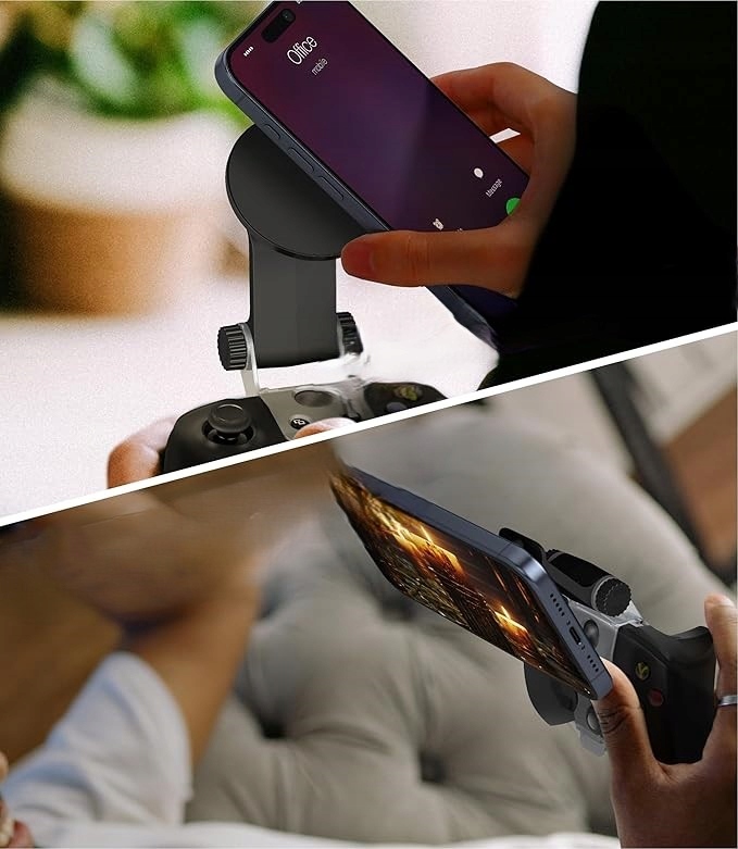 - Найкращий мобільний ігровий контролер: відчуйте свободу віддаленої трансляції та гри в консольні ігри. Незалежно від того, лежите ви в ліжку, відпочиваєте на дивані чи подорожуєте, ви можете без зусиль віддатися іграм у будь-який час. На відміну від затискного тримача, який вимагає постійного позиціонування, з нашим продуктом ви можете миттєво відповідати на вхідні дзвінки та класти телефон протягом секунди