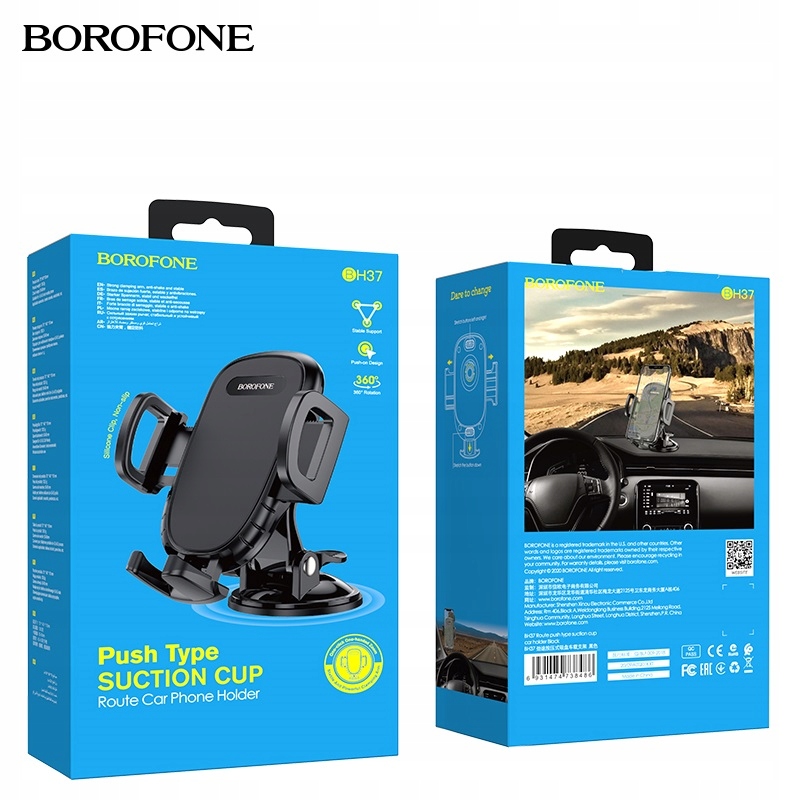 BOROFONE BH37 Route є підвищуючи безпеку водіння, автомобільний затискний тримач для телефону, оснащений присоскою та регульованою рукояткою та кульовим шарніром, прикріплений до панелі приладів / консолі / кабіни автомобіля або бічного / лобового скла за допомогою силіконової присоски з клеєм, оброблений матовою структурою та глянцеві поліровані елементи.