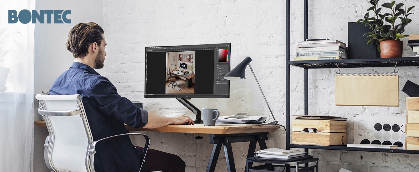Встановіть екран на пружинну підставку для монітора, щоб ваш робочий простір був охайним. Це створює додатковий простір, зменшує напругу завдяки оптимальному розміщенню екрана та забезпечує ефективні умови роботи.