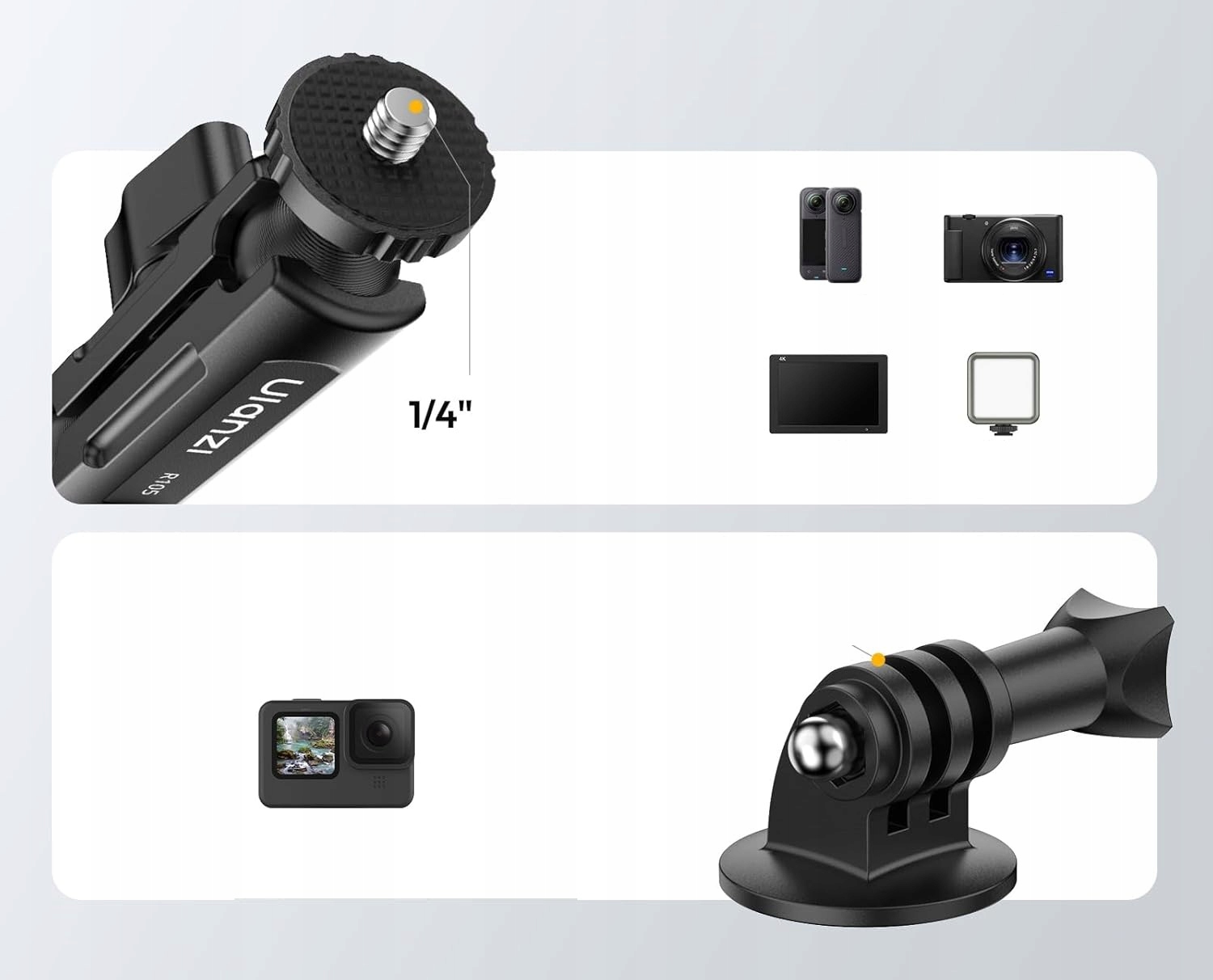 - ▫️мікрофони та інші аксесуари з кріпленням 1/4" або системою типу GoPro.