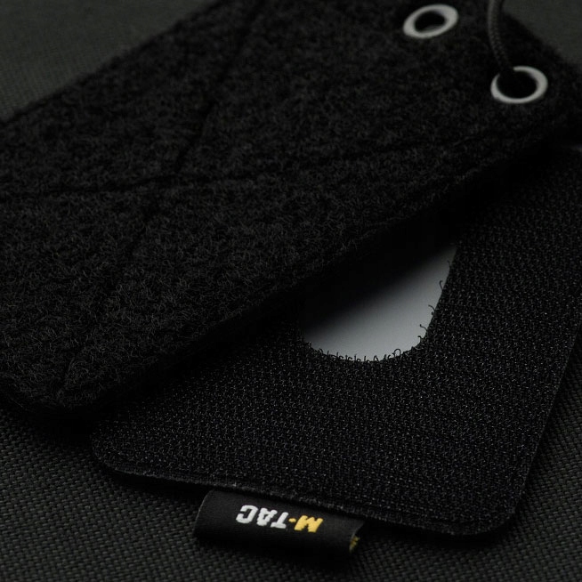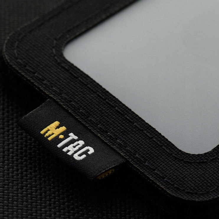 Чохол M-Tac виготовлений з міцної нейлонової тканини, стійкої до вологи та забруднення. Передня панель із прозорим віконцем використовується для зберігання посвідчення особи, стрілецького посвідчення або картки працівника. На задній стінці пришита стрічка-липучка (два шари гачків і петель), тому чохол можна кріпити до одягу чи спорядження за допомогою панелі Velcro, а також розміщувати на ньому емблеми на липучці. У верхній частині є вушка-ланцюжки.