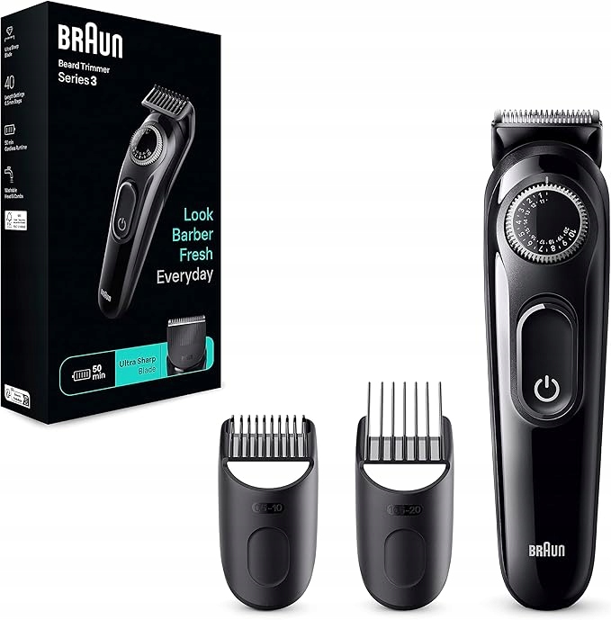 - Отримайте результат, як у перукаря, вдома за допомогою чоловічого тримера для бороди Braun Series 3; Точний для кожного переходу, він оснащений надгострими лезами, які забезпечують оптимальну рівномірність для кожного типу бороди; Чоловіча машинка для стрижки з 40 налаштуваннями довжини; Вміст коробки: 1 електрична бритва з пластиковою тримерною головкою 1 точний гребінець для бороди (0,5-10 мм) 1 точний гребінець для волосся (10,5-20 мм) 1 щітка для чищення