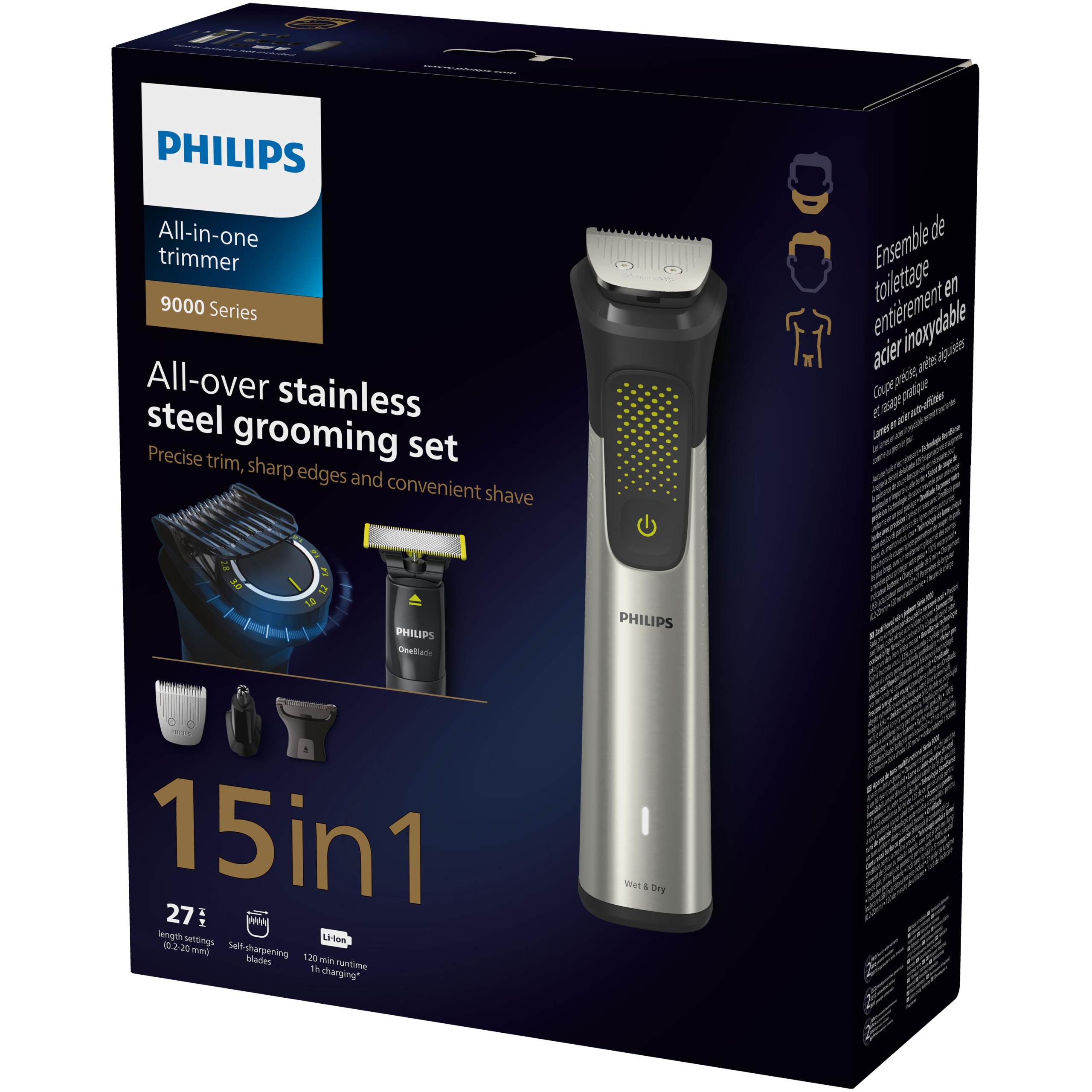 Набір Philips Multigroom 9000 + OneBlade — це універсальне рішення для чоловіків, які хочуть ідеально доглядати за своєю бородою, волоссям і тілом. Тример 15-в-1 дозволяє точно стригти та моделювати, а бритва OneBlade, що входить у комплект, дозволяє точно завершувати лінії та краї – без роздратування та з повним комфортом.