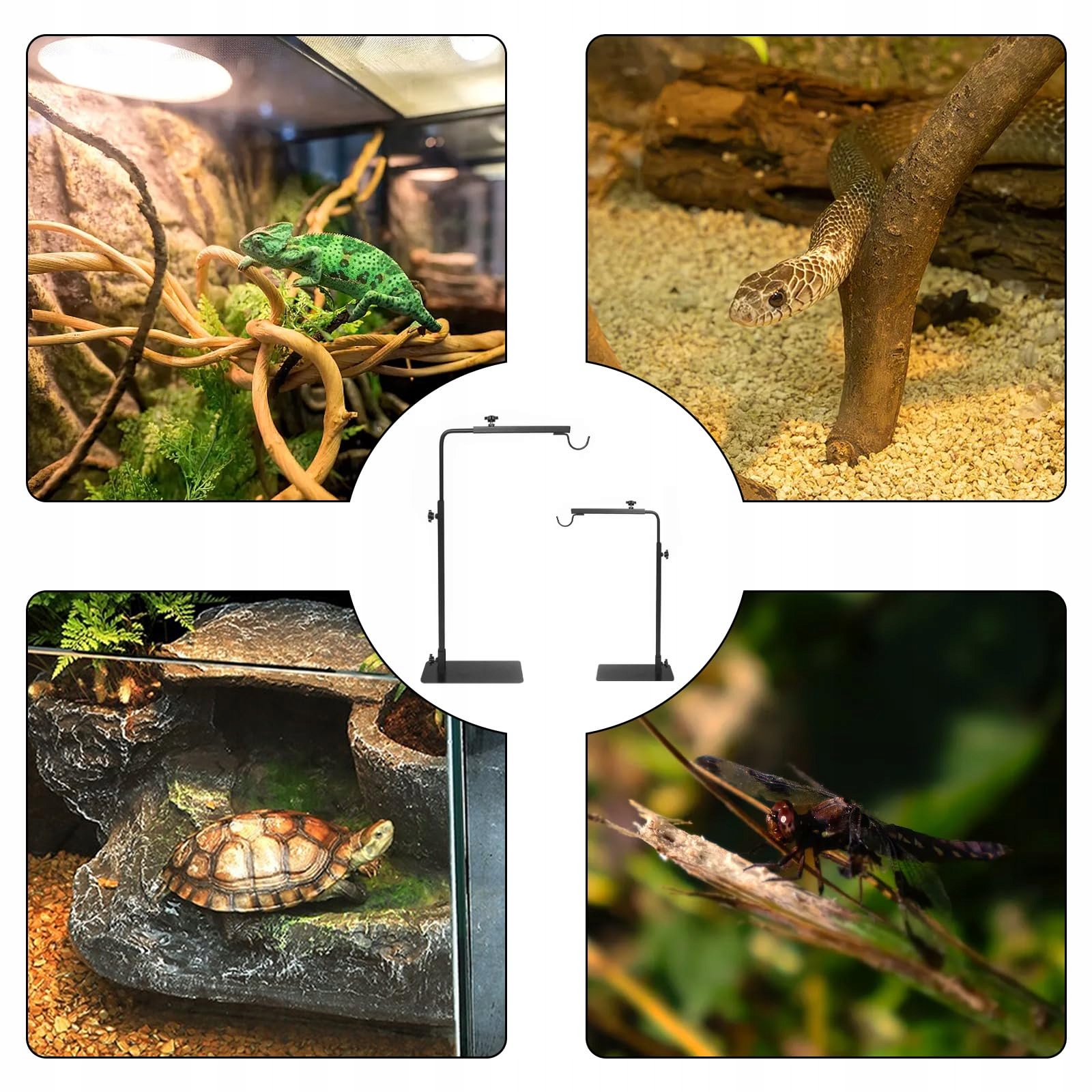 Підставка для теплової лампи ідеально підходить для теплових ламп для рептилій, які зазвичай використовуються для різноманітних земноводних і холоднокровних тварин, таких як ящірки, черепахи, змії, павуки, жаби та багатоніжки. Підставки для ламп також можна використовувати як освітлювальні прилади для сукулентів.