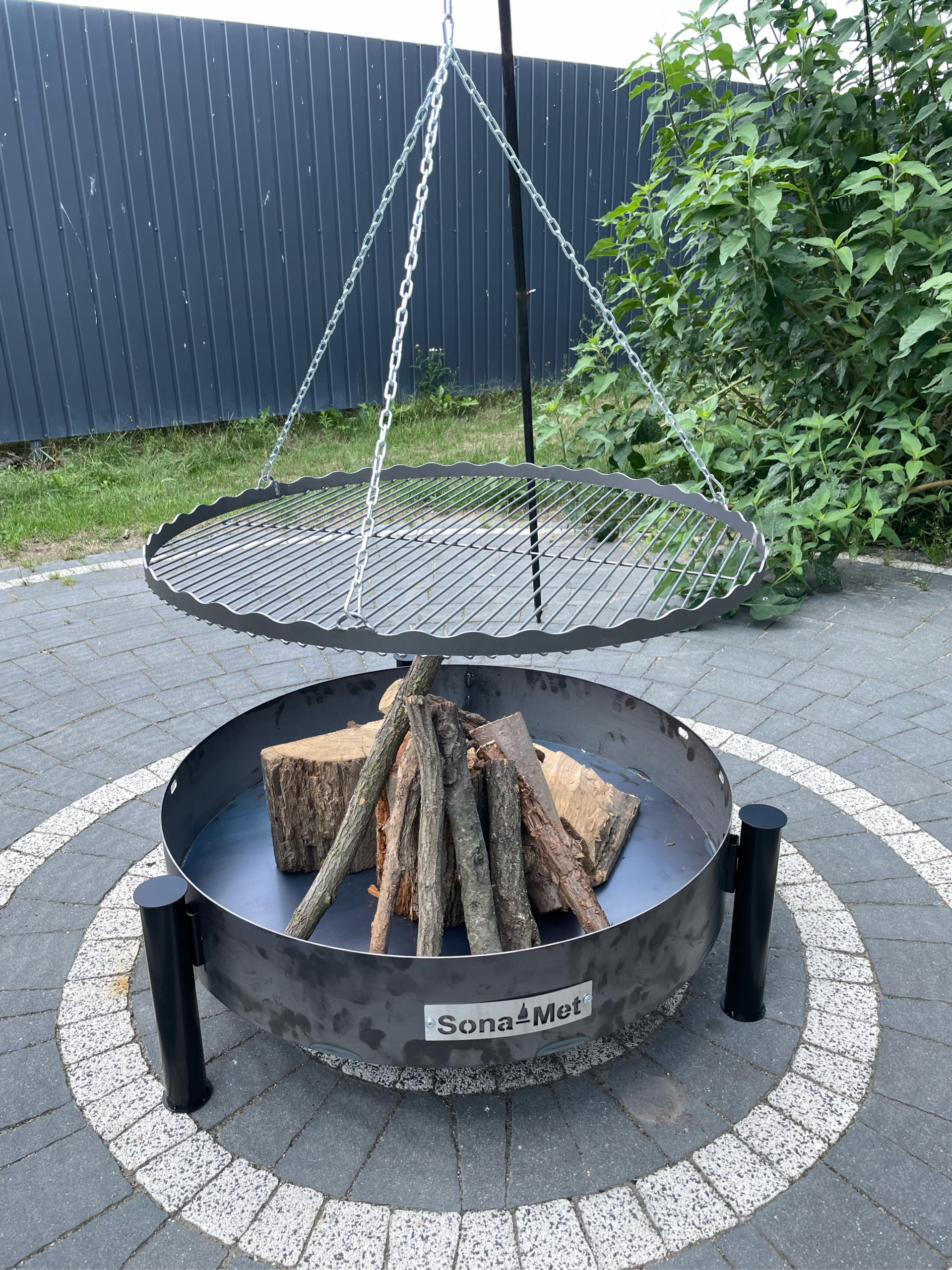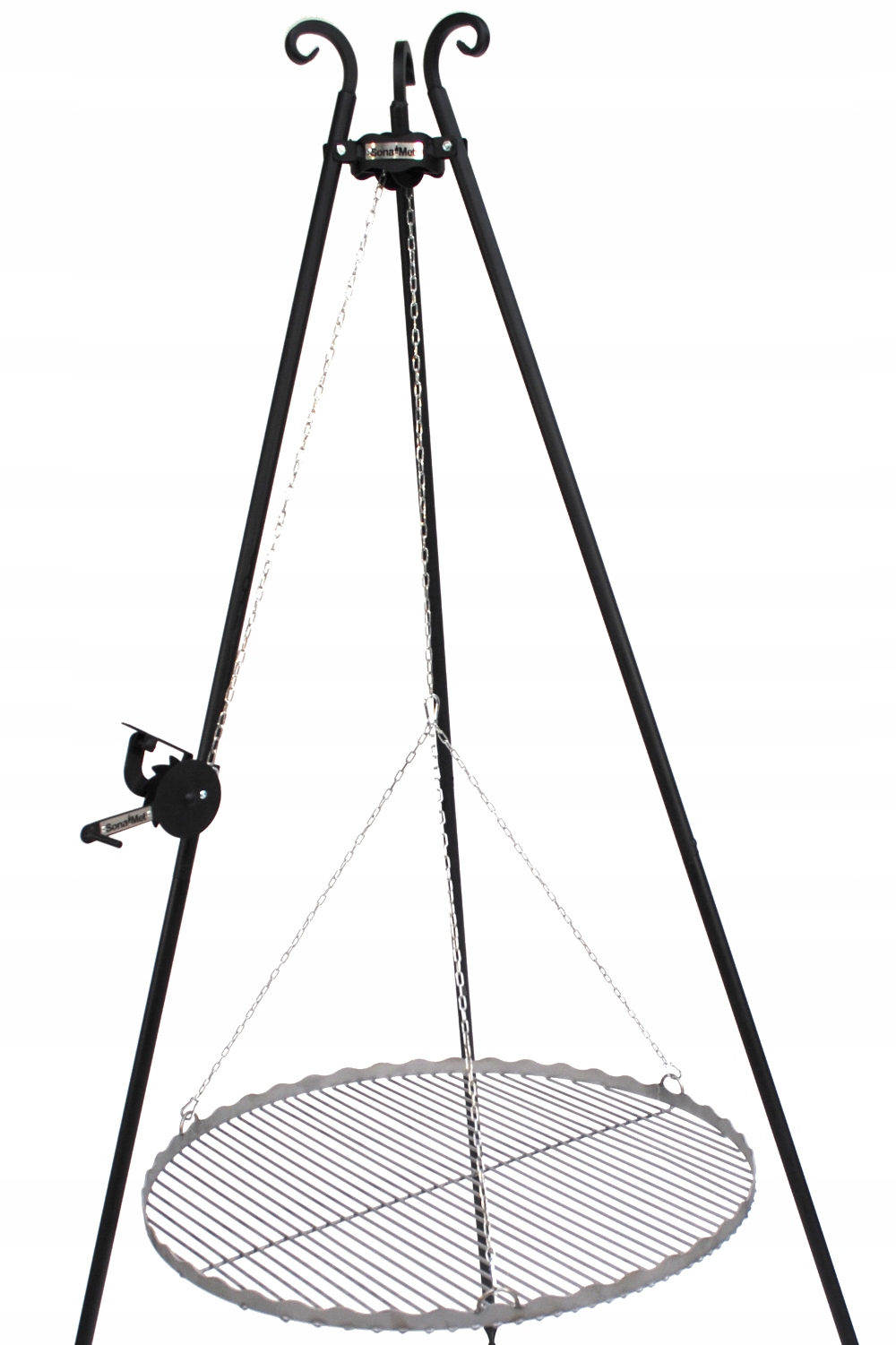 Штатив виготовлений з міцної труби 20мм товщиною до 2,00мм, пофарбований порошковою фарбою в колір RAL 9005. Ролик з декоративною оборкою виготовлений на сучасних верстатах з ЧПК, що дозволяє плавно піднімати та опускати підвіску. решітка або казан. Міцні ланцюги безпечно тримають усе це над розпеченим вугіллям.