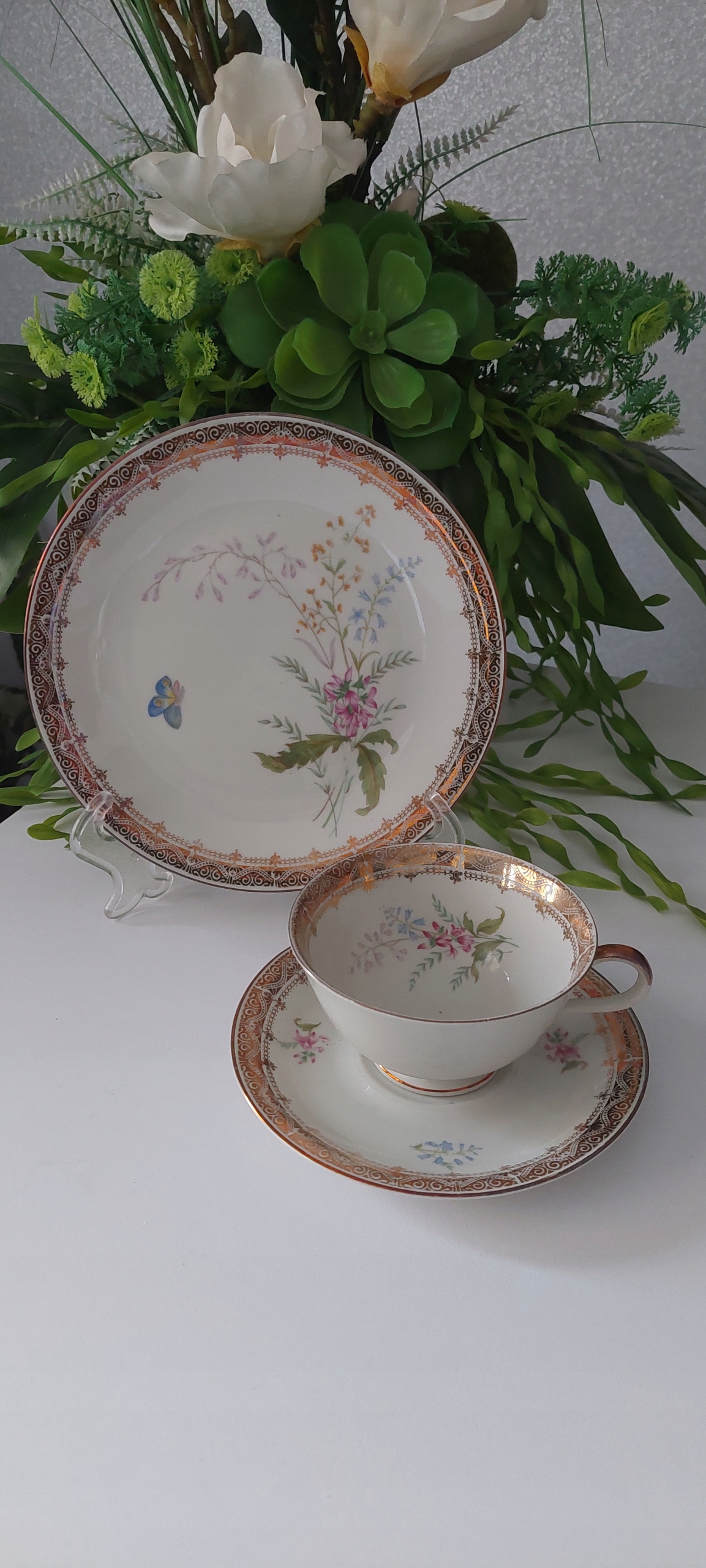 Екрю Тріо з розмірами: висота чашки 5 см, діаметр наповнювача 9 см, діаметр чашки 15 см, діаметр десертної тарілки 20 см.
