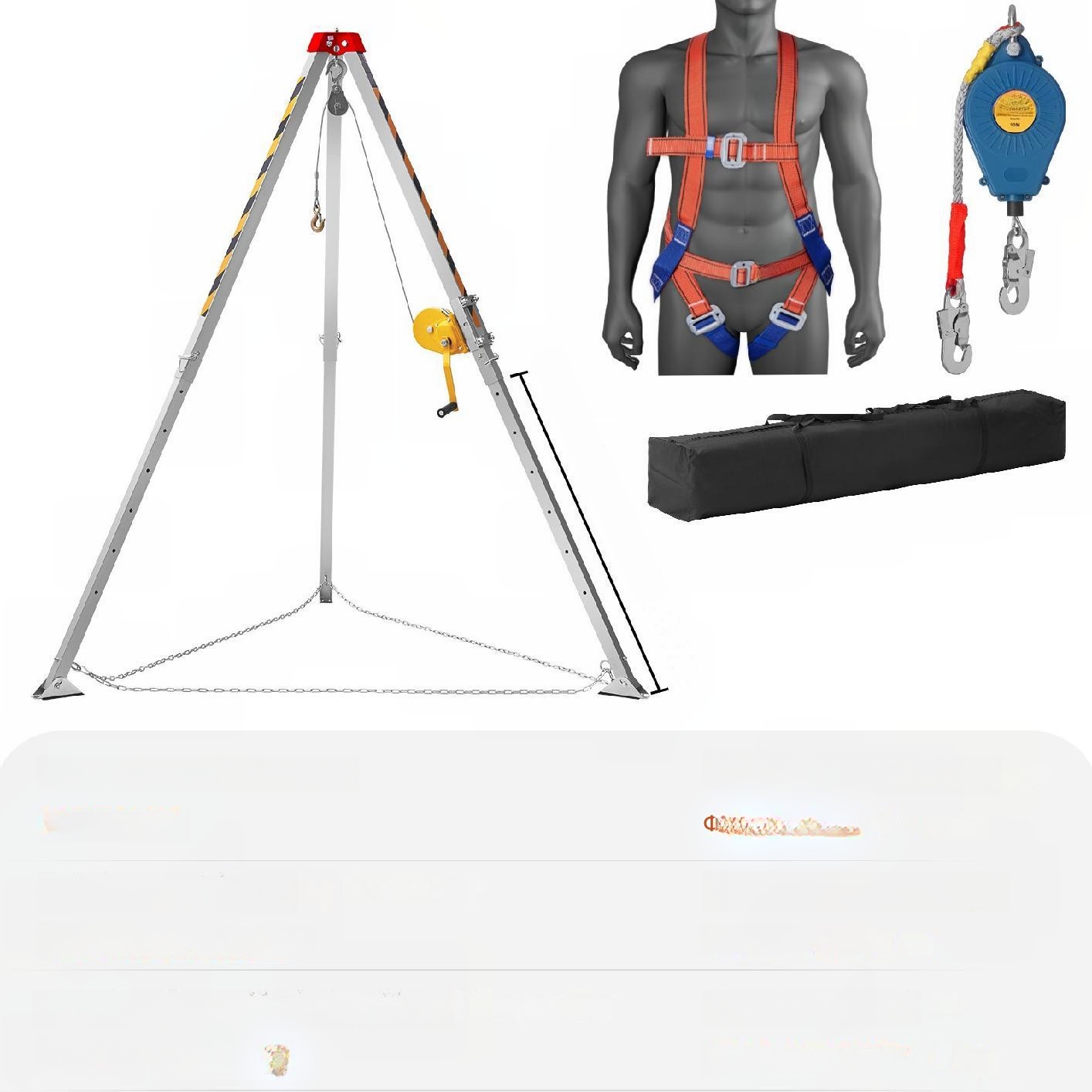 Набір рятувального штатива для закритого простору містить повну безпеку з максимальним навантаженням 158 кг, забезпечуючи повний захист. Крім того, набір включає ефективну систему падіння у разі критичних ситуацій. Все вписується в зручний чорний транспортний пакет, забезпечуючи зручність при русі.