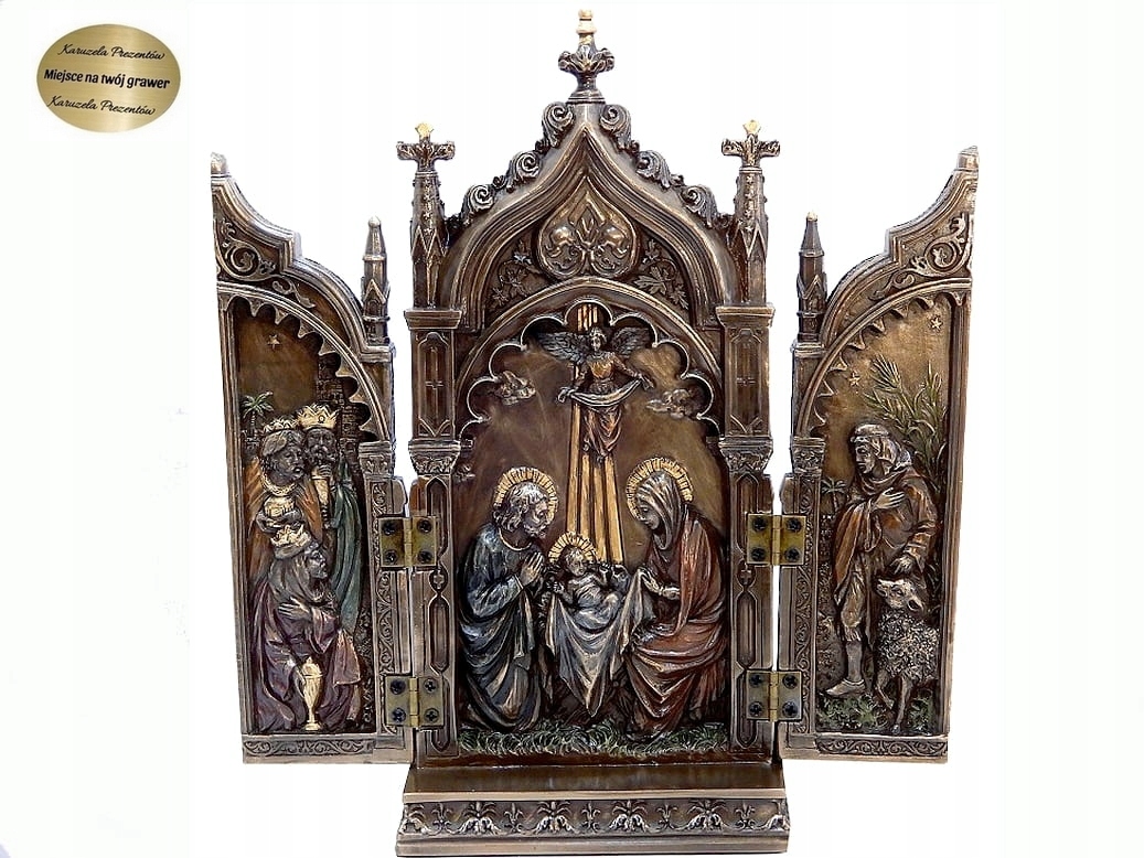 Готичний триптих із зображенням різдвяних сцен є унікальним декоративним елементом, який ідеально вписується в різдвяну атмосферу. Виконаний з найвищою точністю триптих показує центральну сцену Різдва Господнього в оточенні фігур Пресвятої Родини, ангелів і пастухів. Бічні крила зображують додаткові біблійні сцени, які збагачують релігійне та художнє послання.