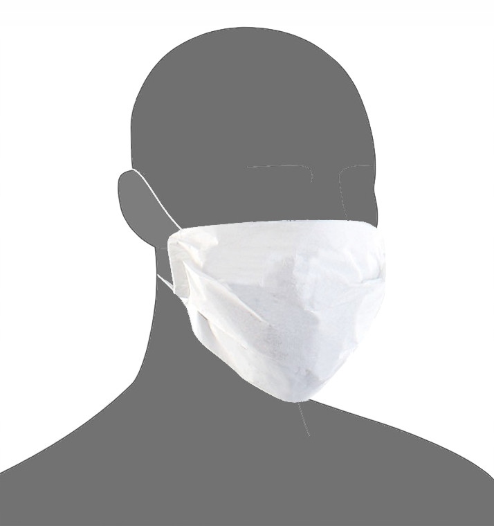 Тришарова одноразова захисна маска з еластичними стрічками для кріплення. Маска обмежує кількість перенесених мікроорганізмів (патогенів) і запобігає торканню чутливих ділянок обличчя (включаючи область рота та носа) брудними руками.