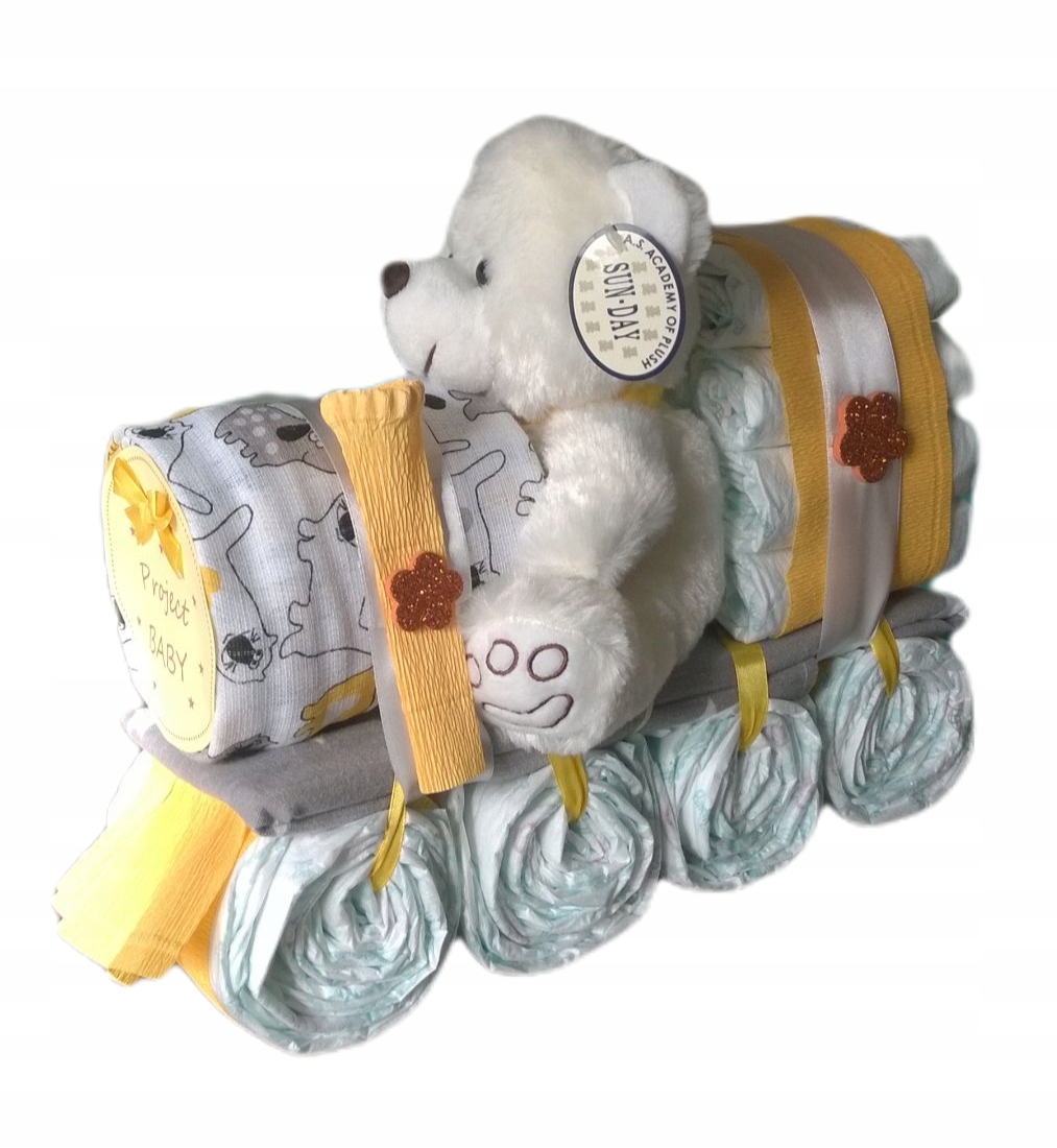 - 34 підгузки PAMPERS - розмір 4 (9-14 кг). Інші розміри доступні в наших пропозиціях. Також ми можемо виготовити паровозик з пелюшок Dada.