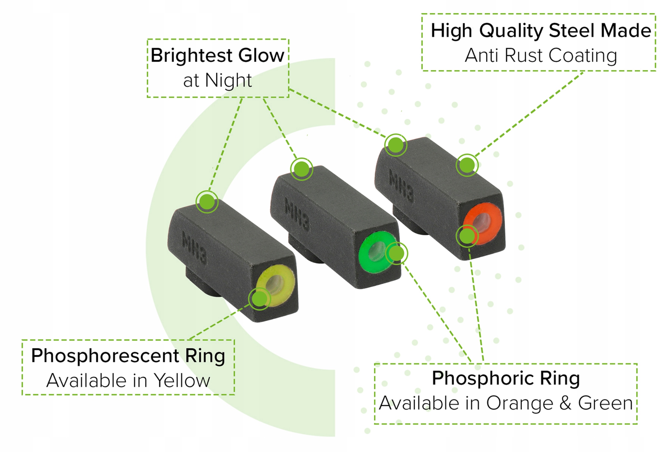 Фіксовані прицільні пристосування Hyper-Bright мають надзвичайно яскраве, контрастне та кольорове кільце мушки.