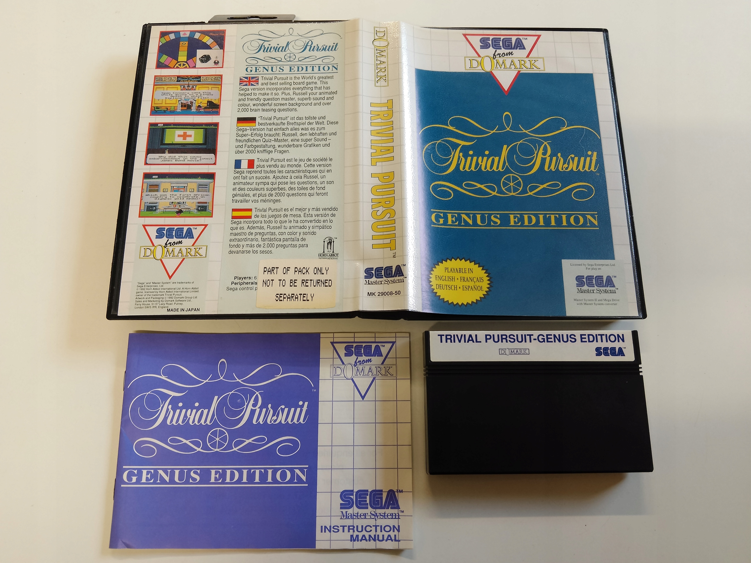 Просматривая «Trivial Pursuit Master System Eng Sega», вы можете быть уверены, что данный товар из каталога «Sega (Game Gear, Master System)» будет доставлен из Польши и проверен на целостность. В цене товара, указанной на сайте, учтена доставка из Польши. Внимание!!! Товары для Евросоюза, согласно законодательству стран Евросоюза, могут отличаться упаковкой или наполнением.