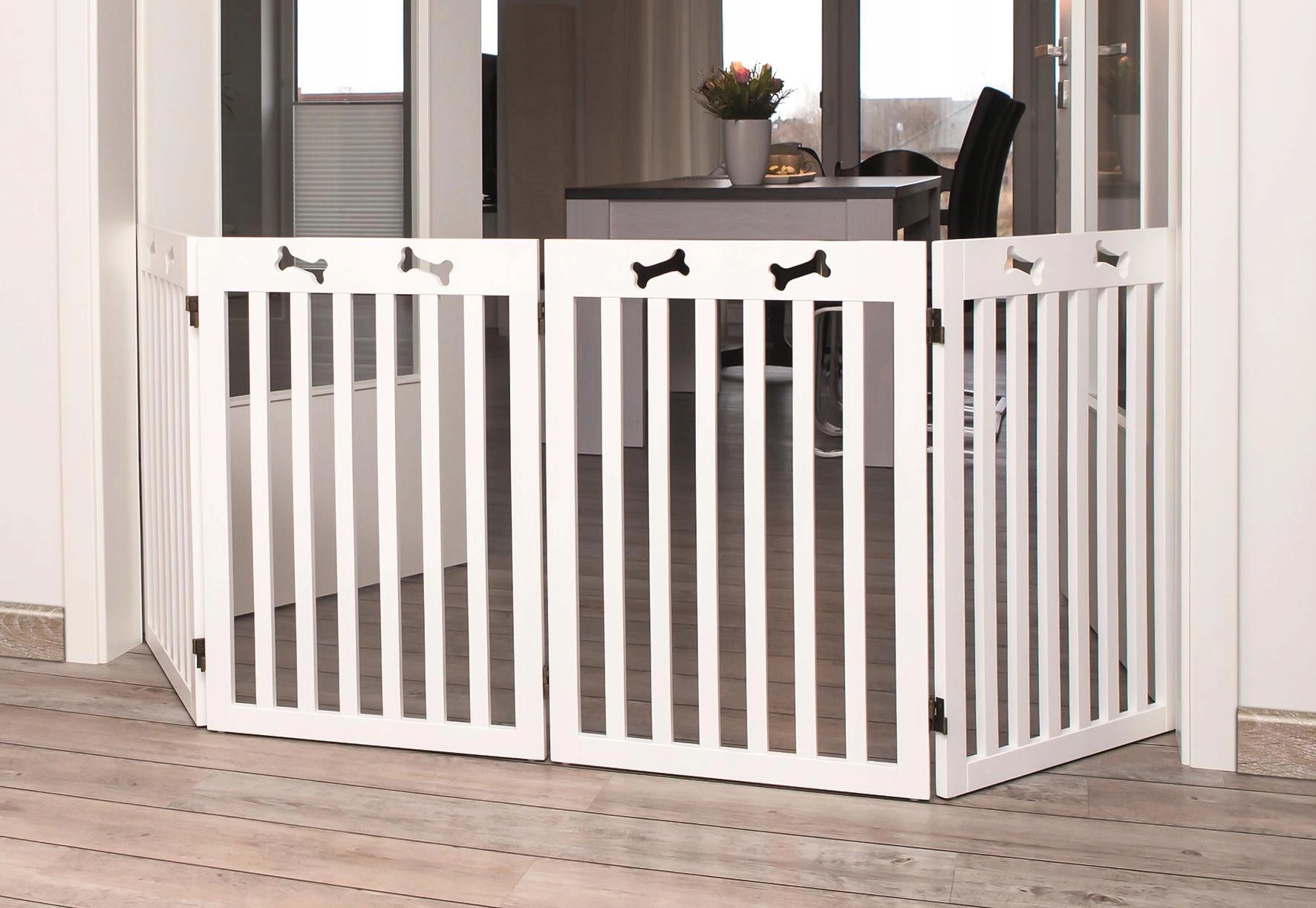 Переконайтесь, що ваша собака та контроль за межею від Trix. Ворота виготовлені з лакованого MDF і ідеально підходять для блокування кімнат, сходів та інших місць, які ви хочете захистити від собаки. Ворота легко регулюються і можуть бути пристосовані до розмірів проходження шириною від 60 до 160 см і висотою 75 см.