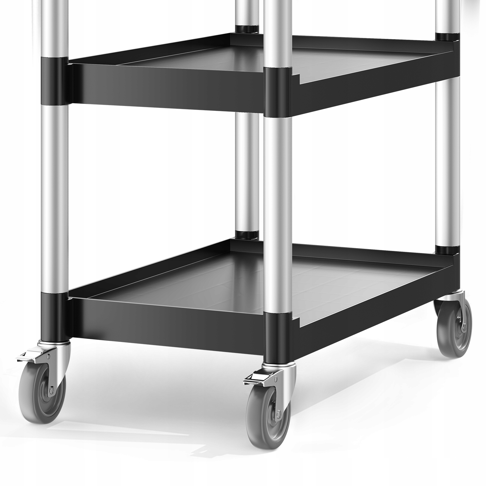 Цей 3-ярусний візок для інструментів (34,65 x 16,14 x 39 дюймів / 880 x 410 x 990 мм) ідеально підходить для організації! Верхня полиця витримує вагу 100 фунтів/45 кг, а середня та нижня полиці витримують вагу 150 фунтів/68 кг кожна. Оснащений 4 колесами, що плавно обертаються на 360° (2 з гальмами) і ергономічними ручками, його легко переміщати. Виготовлений із міцного промислового ПП і посиленої алюмінієвої рами, він стабільний і довговічний. Ідеально підходить для гаражів, офісів, класів і житлових приміщень!
