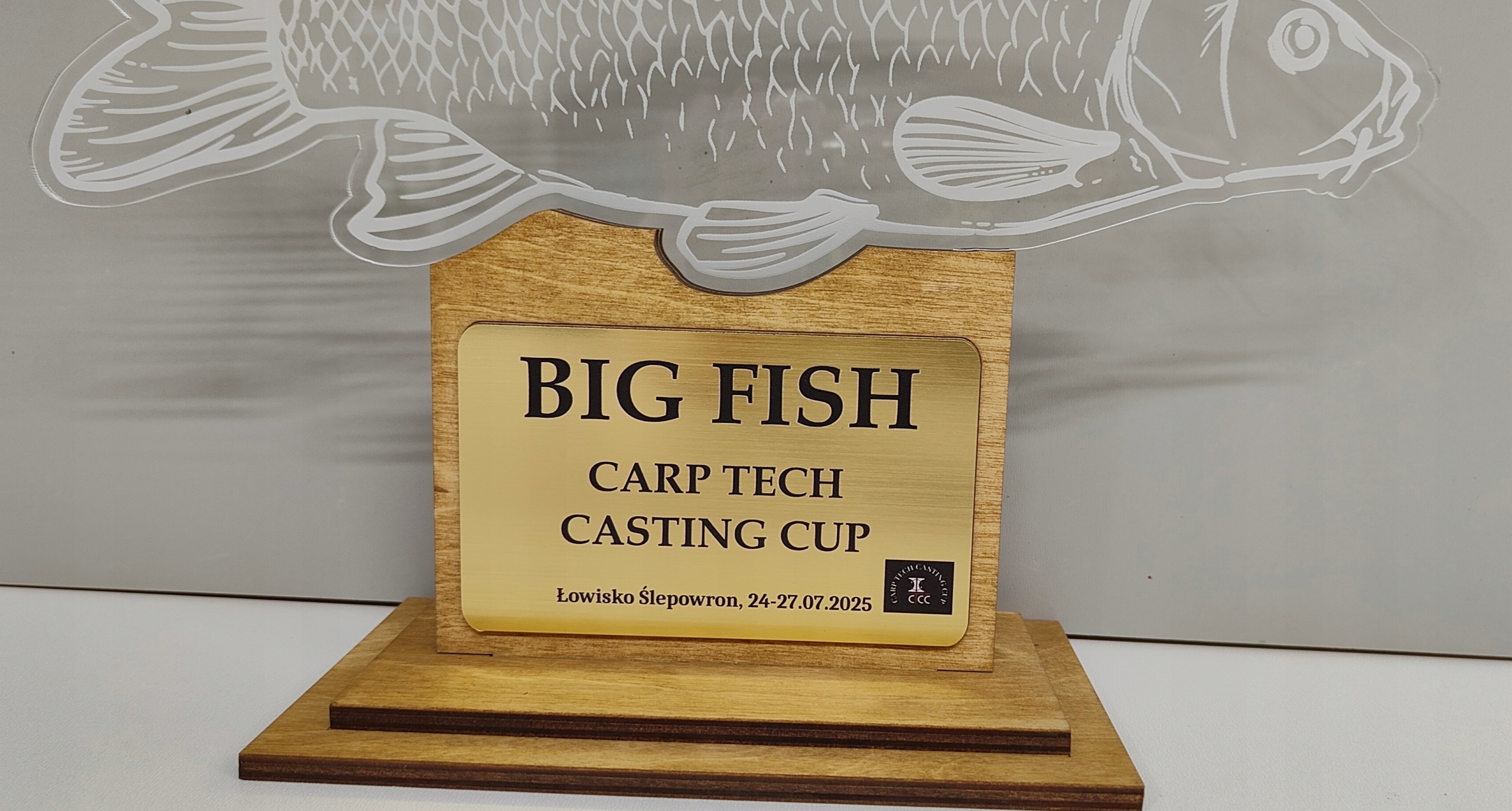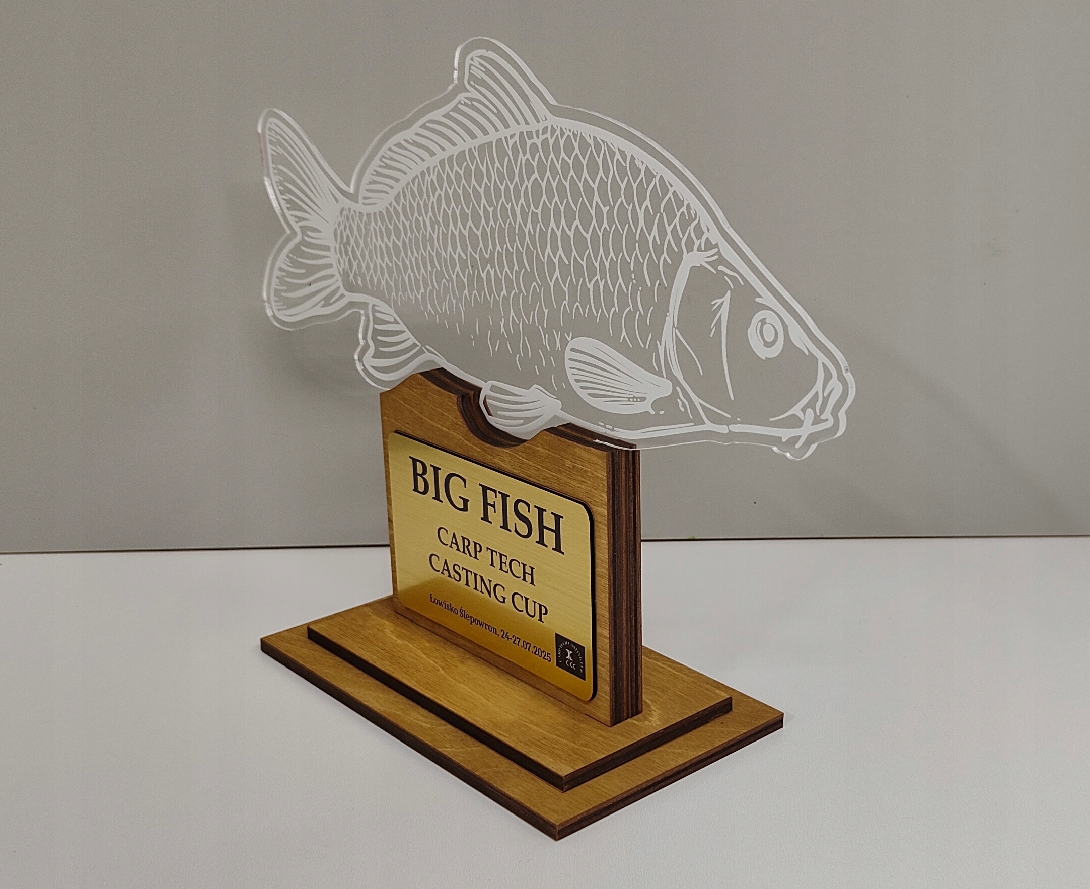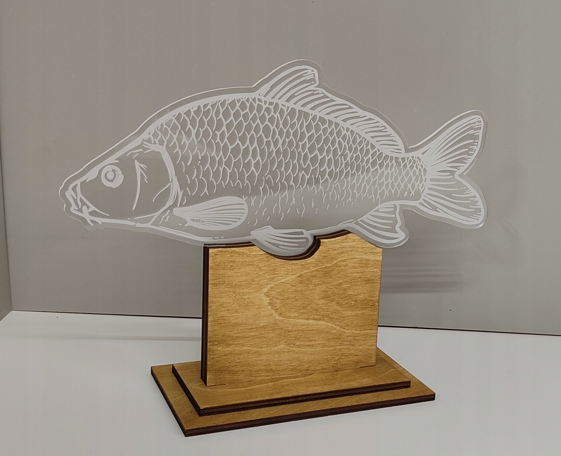 Статуя з вигравіруваним коропом - Елегантна нагорода з комбінації оргскла та дерева.
