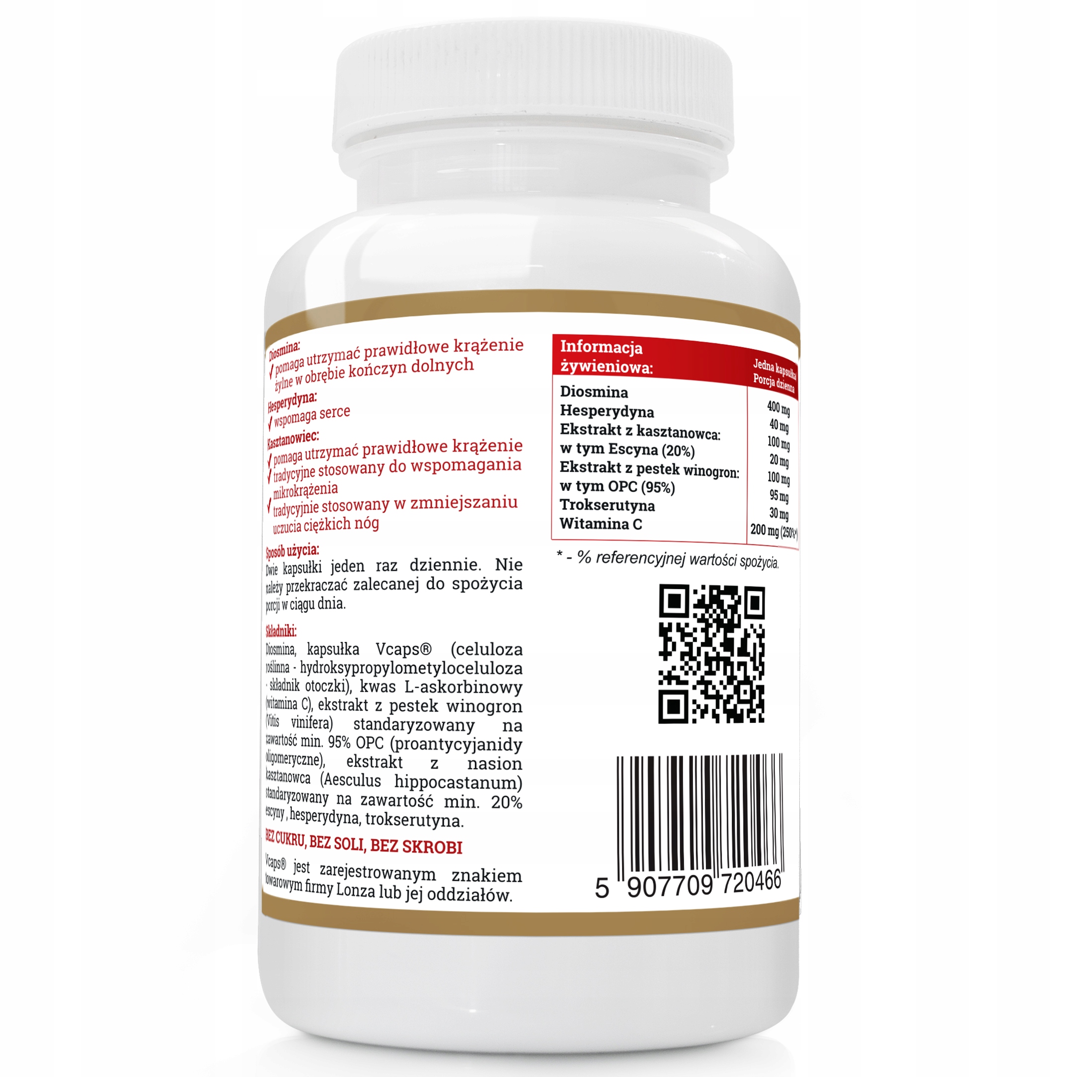 СКЛАД: діосмін, рослинна капсула Vcaps® (гідроксипропілметилцелюлоза - компонент оболонки), L-аскорбінова кислота (вітамін С), екстракт виноградних кісточок (Vitis vinifera) ) стандартизований для вмісту мін. 95% OPC (олігомерні проантиціанідини), екстракт насіння кінського каштана (Aesculus hippocastanum), стандартизований для вмісту мін. 20% есцин, гесперидин, троксерутин.