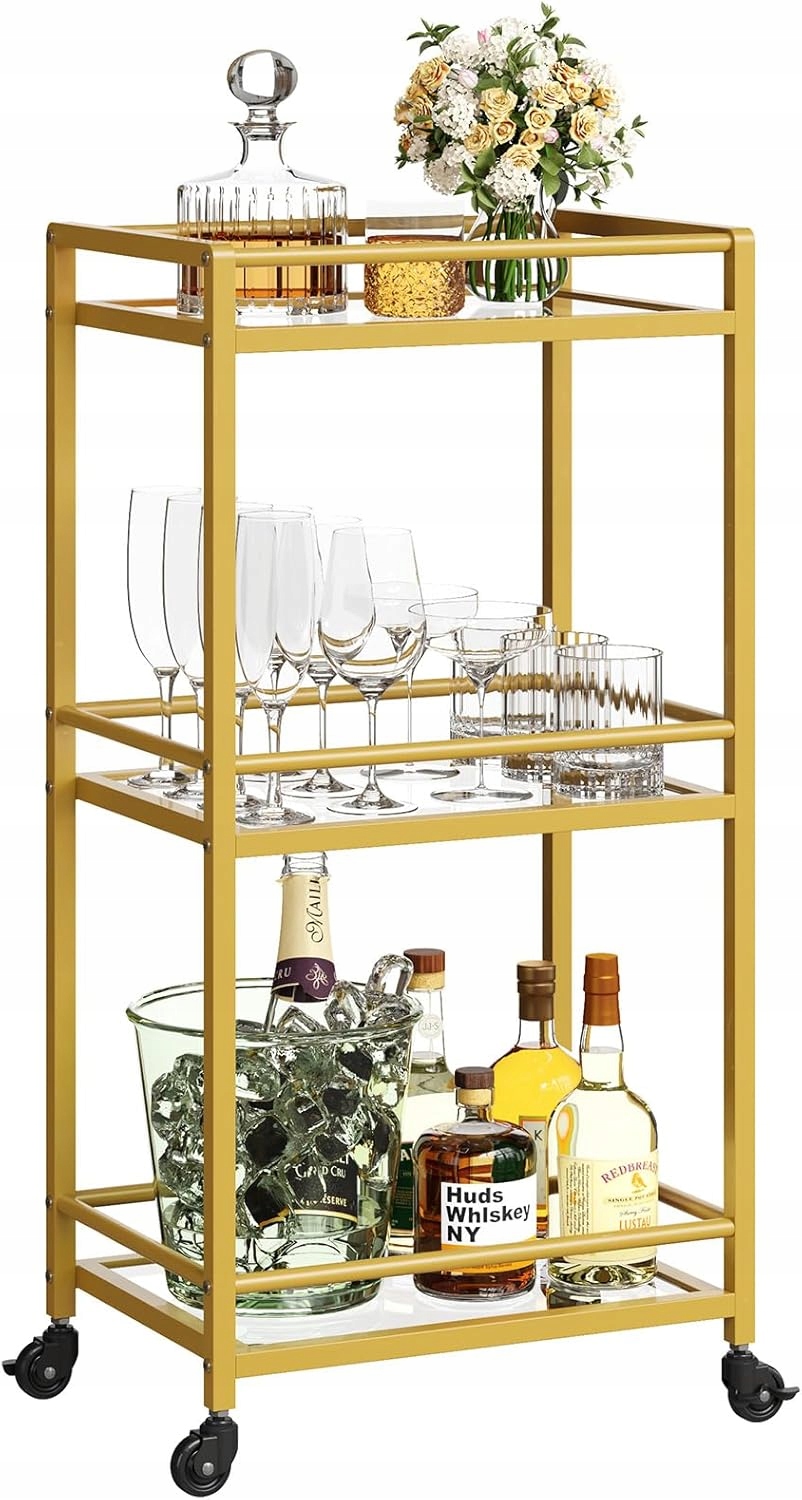 Універсальна коляска: Ця 3-рівна коляска бару пропонує багато місця для зберігання пляшок та аксесуарів. Він служить не лише як візок з бару, але і як кухонний коляска, кавова коляска, візок для напоїв та мікрохвильова коляска. Додайте декоративний акцент до залу, кухні, вітальні чи офісної кімнати завдяки цьому стильному елементу.
