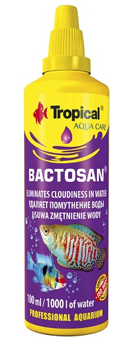 BACTOSAN усуває помутніння води після перегодовування риб. Препарат призначений для освітлення акваріумної води, яка помутніла внаслідок поганої фільтрації або перегодовування риб. Помутніння води з'являється також у новостворених резервуарах з невстановленою біологічною рівновагою. BACTOSAN швидко і ефективно відновлює прозорість води, що покращує умови життя риб і естетичну цінність акваріума. Застосовується в нерестових акваріумах, позитивно впливає на виживання ікри та виведення ніжних видів риб. Після зникнення біологічної каламуті ми рекомендуємо використовувати BACTO-ACTIVE в акваріумі. При повторному появі біологічної каламутності необхідно проаналізувати: ефективність фільтрації, кількість згодовуваного корму, щільність посадки, частоту заміни води. Постійне повторення проблеми свідчить про біологічний дисбаланс в акваріумі.
