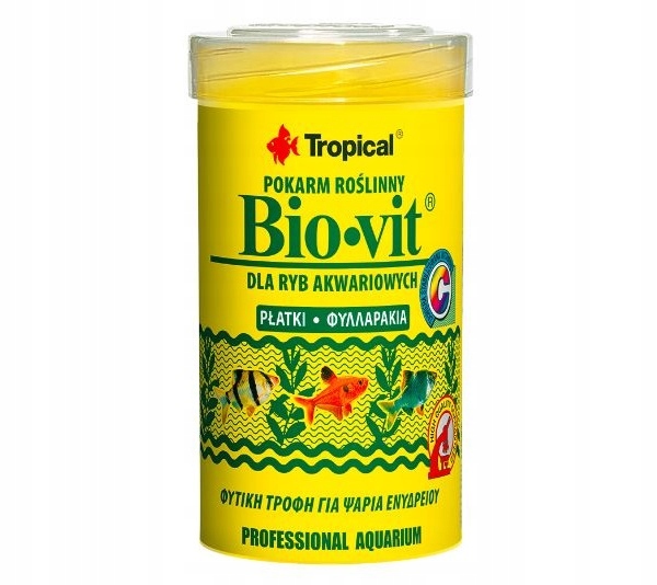Тропічний БІО-ВІТ - рослинний корм у формі пластівців. Пластівці БІО-ВІТ - рослинний корм для щоденного годування травоїдних риб і додатковий корм для всеїдних риб. Незамінні в загальних акваріумах з різними видами риб. Оптимально збалансований склад і додавання необхідних рибам вітамінів і мікроелементів, в тому числі із зародків пшениці, забезпечують правильний ріст і розвиток. Заслуговує на увагу значний вміст стабілізованого вітаміну С, який, крім іншого, посилює опірність риби хворобам і прискорює загоєння ран і саден. Регулярне годування кормом BIO-VIT знижує ризик виникнення запорів і запалень травного тракту, до яких особливо схильні травоїдні риби з довгим травним трактом. Ці властивості корму зумовлені високим вмістом баластних речовин, у тому числі клітковини, яка стимулює перистальтику кишечника, і біологічно активних речовин, які містяться в кропиві.