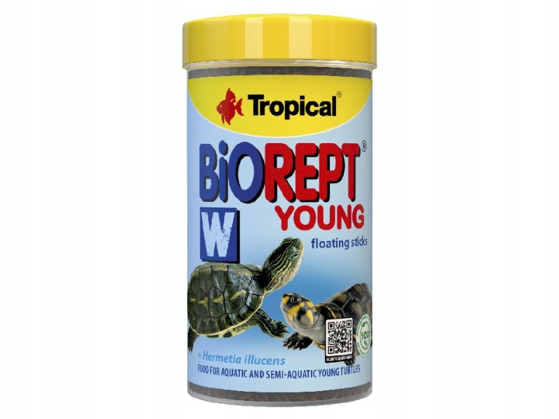 Tropical Biorept W Young — багатокомпонентний корм у формі маленьких плаваючих паличок, створений для щоденного харчування молодих всеїдних і м’ясоїдних черепах. Містить личинки Hermetia illucens (BSF), багаті легкозасвоюваними мінералами та білком, що підтримує здоровий розвиток і міцну оболонку.
