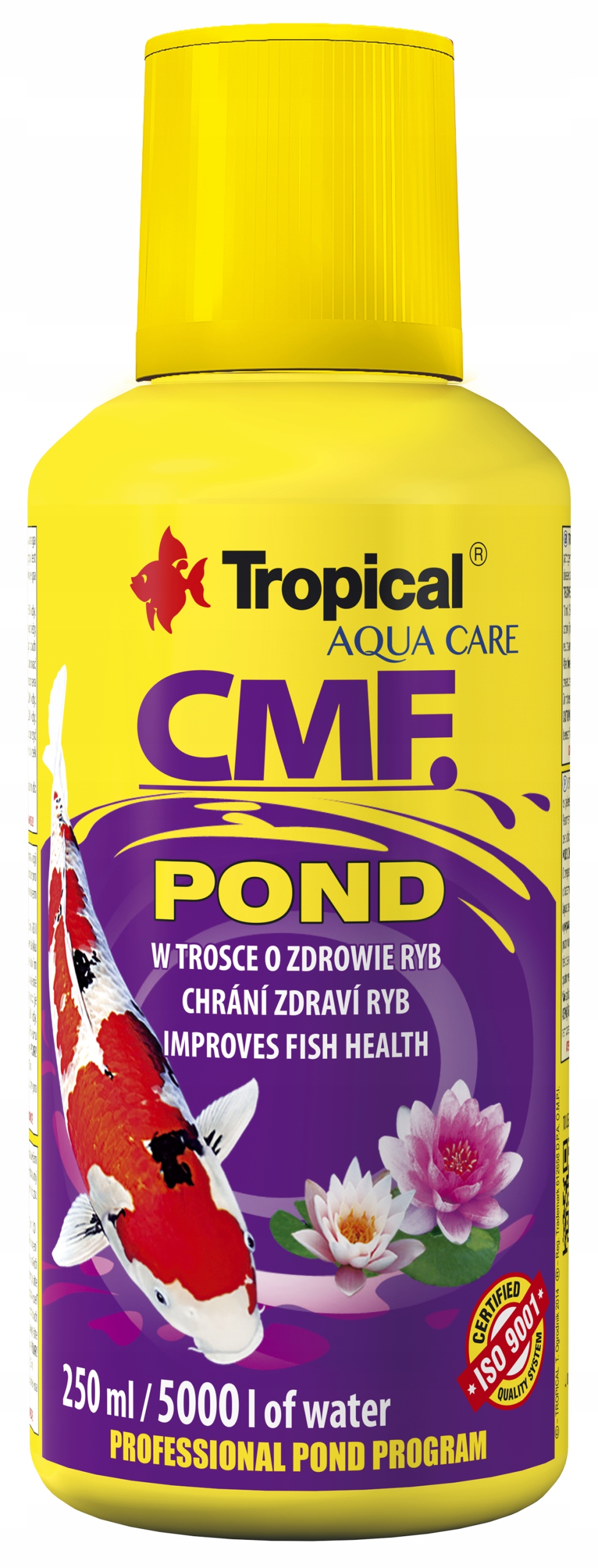 TROPICAL CMF POND препарат для ставків із широким спектром застосування, який підтримує риб у боротьбі з небезпечними патогенами, такими як бактерії та грибки. Це також особливо застосовуваний у водоймах, в яких виявилася віспа риб, спричинена жовчним хробаком (Ichthyophthirius multifiliis). Однієї упаковки CMF POND (250 мл) достатньо для приготування ванни в ставку об'ємом 5000 літрів. Для великих резервуарів ми рекомендуємо препарат, розфасований в 2-літрову каністру, яка дозволяє підготувати 40 000 літрів води. Проте, якщо є можливість, ми рекомендуємо купати риб поза водоймою (акваріум, велика ємність), що значно полегшує спостереження за рибою.