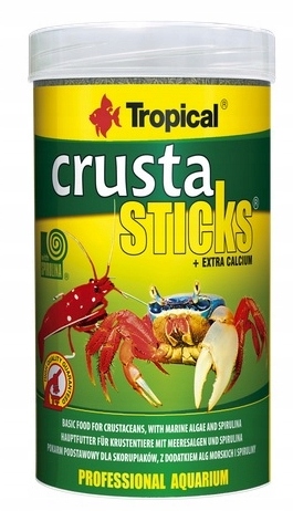 CRUSTA STICKS - це палички для ракоподібних з морськими водоростями та спіруліною. CRUSTA STICKS - це корм у вигляді швидко тонаючих паличок, з високою гідростабільністю, які містять додавання морських водоростей і спіруліни (6%). Корм CRUSTA STICKS призначений для годування. всі типи креветок карликова креветка (наприклад, "amano", "babaulti", "red cherry", "biene", "tigro shrimp", "blue shrimp") і мульти-креветки (Macrobrachium sp.) та інші водні ракоподібні, в т.ч. вибагливі морські креветки. Палички містять підвищений вміст кальцію, який необхідний для побудови та розвитку панцирів у ракоподібних.