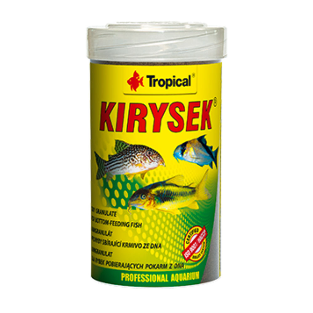 Рецепт Кірисек містить ідеально збалансовані інгредієнти тваринного та рослинного походження, які задовольняють харчові потреби риб, впливаючи на їх правильний ріст і розвиток. Правильно складений комплекс вітамінів і мікроелементів забезпечує відмінний стан риб і зміцнює їх імунітет. Для урізноманітнення раціону донних риб рекомендуємо також інші гранульовані корми від торгової марки Tropical: WELSI GRAN, CICHLID GRAN, D-ALLIO PLUS GRANULAT, SPIRULINA GRANULAT та корми в таблетках, наприклад SUPERTABIN B.