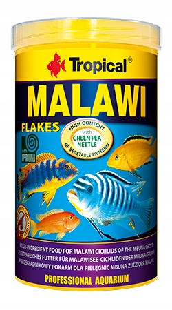 Багатокомпонентний корм у формі пластівців із високим вмістом рослинних інгредієнтів (шпинат, кропива, спіруліна, зародки пшениці та ін.) призначений для щоденного годування риби мбуна з озера Малаві. Довгий кишечник цих цихлид працює правильно завдяки значній частці клітковини в їжі, яка захищає риб від запорів і запалень травного тракту, небезпечних для здоров'я риб. Процес травлення також сприяють активні речовини, що містяться в спіруліні і кропиві. Джерелом легкозасвоюваного рослинного білка є, в тому числі, зелений горошок. Ненасичені жирні кислоти, відповідальні за підтримку гарного стану шкіри та зміцнення її захисних бар'єрних функцій, походять, зокрема, із зародків пшениці. Додавання L-карнітину підтримує жировий обмін, забезпечуючи рибу додатковою енергією та знижуючи ризик набору жиру. Високий смак робить пластівці MALAWI охоче поїданими навіть спійманою рибою. Надзвичайно різноманітна рецептура корму гарантує, що риба, яка отримує його регулярно, має чудовий стан і гарний колір, а також сприяє нересту риби.