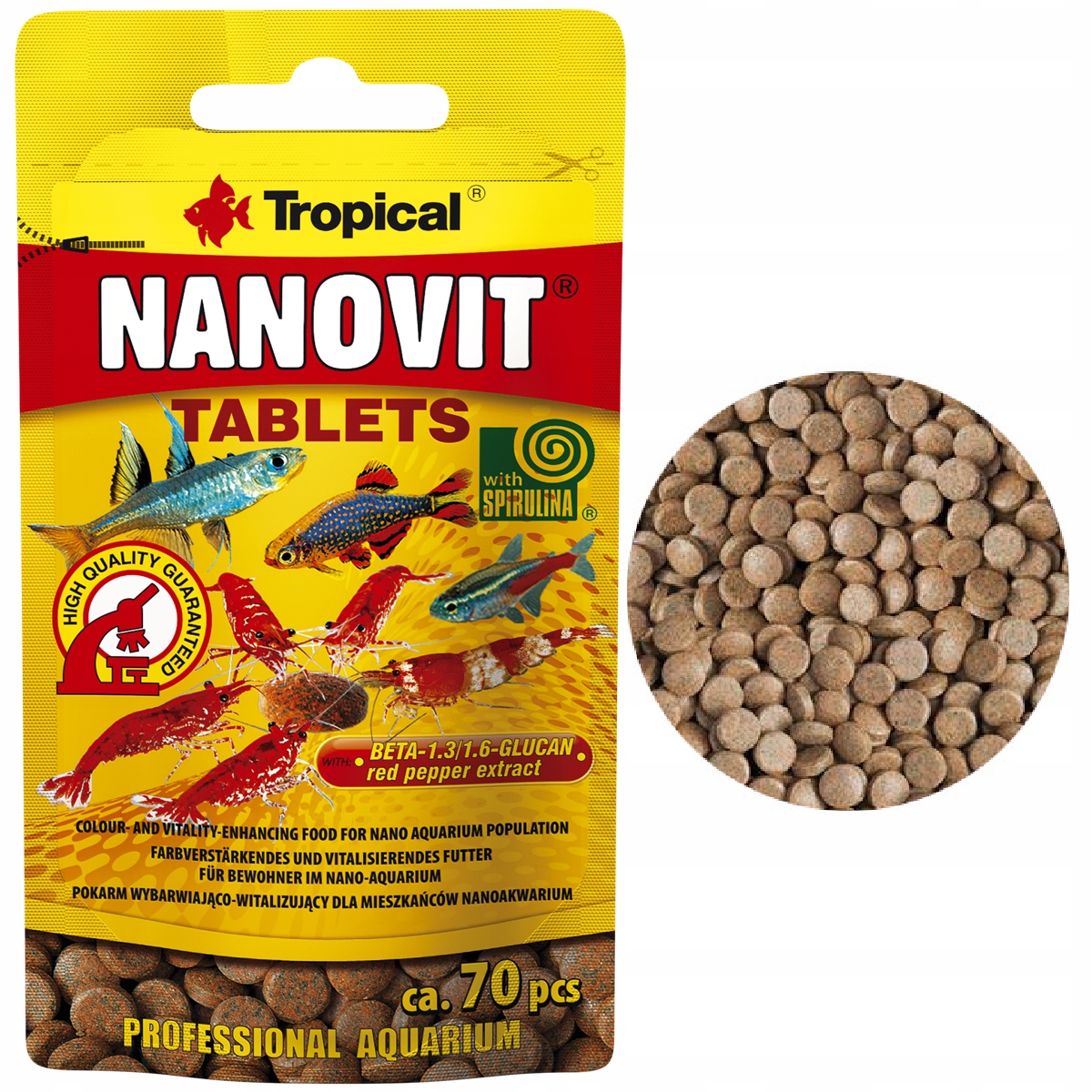 Таблетки Нановіт можна використовувати як у вигляді тонаючих, так і в якості самоклеючих таблеток. Завдяки своїм розмірам вони особливо рекомендовані для дрібних видів всеїдних і хижих риб, а також для ракоподібних і равликів в нано акваріумах. Вони не завантажують резервуар надмірною кількістю органічних речовин, що полегшує утримання нано акваріума в чистоті і тим самим обмежує ріст водоростей. Кольори риби посилюються природним астаксантином, бета-каротином і екстрактом червоного перцю, які також благотворно впливають на багато фізіологічних процесів, зокрема: ріст і розмноження. Наявні в їжі молюски і ракоподібні, в тому числі смачні кальмари, є джерелом дуже легкозасвоюваного білка. Природний імуностимулятор - бета-глюкан - і активні речовини спіруліни зміцнюють імунну систему риб і ракоподібних.