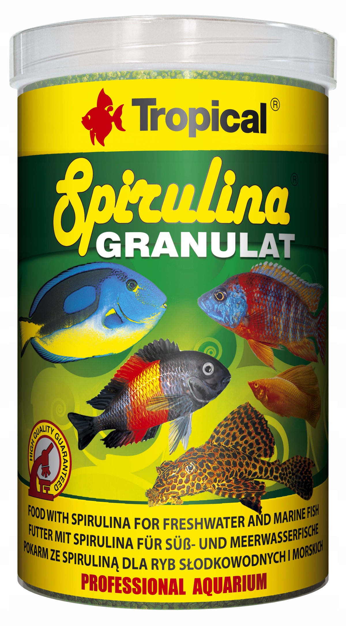 TROPICAL SPIRULINA GRANULAT - це корм у вигляді повільно тонаючих гранул з додаванням спіруліни (6%), призначений для щоденного годування рослиноїдних і всеїдних риб у прісноводних і морських акваріумах. Водорості, що містяться в кормі, є джерелом легкозасвоюваного білка, вітамінів і мікроелементів, які впливають на відмінний стан риб і їх ріст і розвитку. Спіруліна надзвичайно багата природними каротиноїдами, які при регулярному згодовуванні посилюють забарвлення риби, а також впливають на багато фізіологічних процесів, включаючи дозрівання та розмноження. Додавання цеоліту сприятливо впливає на травну систему та виведення токсинів з організму. риба.
