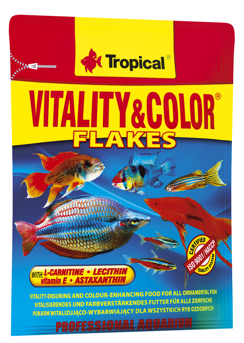 Завдяки підвищеному вмісту протеїну, вітаміну Е і лецитину рекомендується особливо в період росту і розмноження риб. Натуральні барвники, присутні в їжі - бета-каротин і астаксантин з червоних водоростей Haematococcus pluvialis, посилюють забарвлення риби і благотворно впливають на багато фізіологічних процесів, в тому числі на репродукцію, захищають клітини від шкідливого впливу вільних радикалів. Щоб риби могли краще використовувати жири, що містяться в їжі, Vitality & Color збагачено L-карнітином, який підтримує їхній метаболізм. Ми рекомендуємо використовувати Vitality & Colour разом із рослинною їжею, наприклад пластівцями спіруліни.