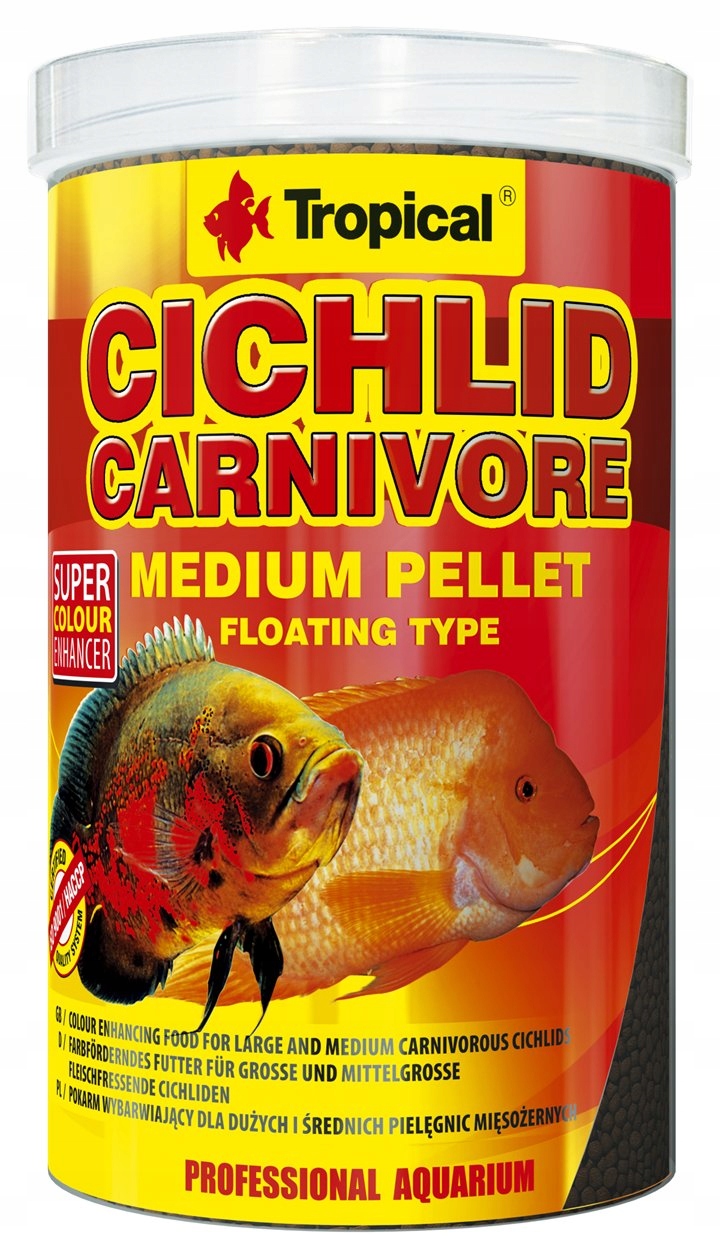 Високий вміст природних каротиноїдів, у тому числі астаксантин, благотворно впливає на стан риб і підсилює їх колір. Багатий екзогенними амінокислотами, протеїн відповідає харчовим потребам м’ясоїдних риб. Cichlid Carnivore Medium Pellets характеризується винятковою гідростабільністю, яка запобігає вимиванню цінних поживних речовин. Сучасний процес виробництва збільшує засвоюваність поживних речовин.
