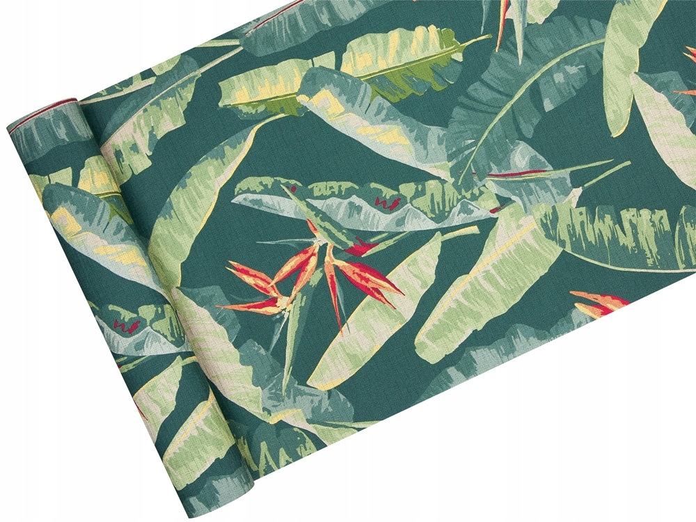 - Візерунок: червоні квіти стреліції серед бананового листя. Шпалери виглядають як картина, написана водяними фарбами на щільному лляному полотні.