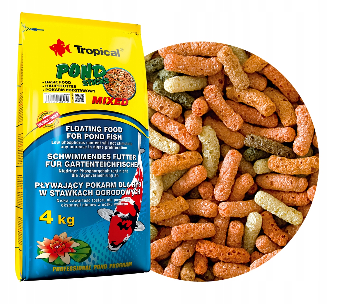 POND STICKS MIXED багатокомпонентний корм у формі плаваючих паличок. Багатокомпонентний корм у вигляді плаваючих паличок для коі, золотих рибок та інших декоративних карпових, що містяться в садових водоймах і ставках. Корм повністю відповідає харчовим потребам риб, підсилюючи при цьому їх червоний і золотистий колір. Знижений вміст фосфору зменшує надходження цього елемента у водойму разом з кормом, таким чином знижується ризик цвітіння водоростей. Корм використовуємо з ранньої весни до пізньої осені, при температурі води вище 10°C і під час зимівлі риби в приміщенні.