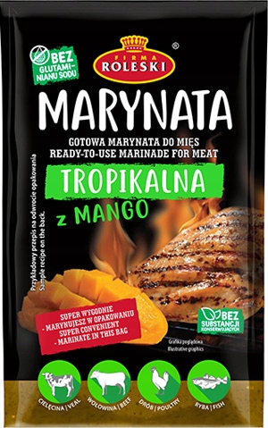 Тропічний маринад - це оригінальна композиція оригінальних смаків, так добре відомих шанувальникам далекосхідної кухні. Поєднання солодощів плодів манго та добірних спецій: коріандру, часнику, куркуми, імбиру, підсилених ноткою перцю чилі, зроблять смак наших страв незабутнім. Ця екзотична добавка чудово поєднується з м’ясними стравами на грилі та підкреслює смак тушкованої птиці та риби.