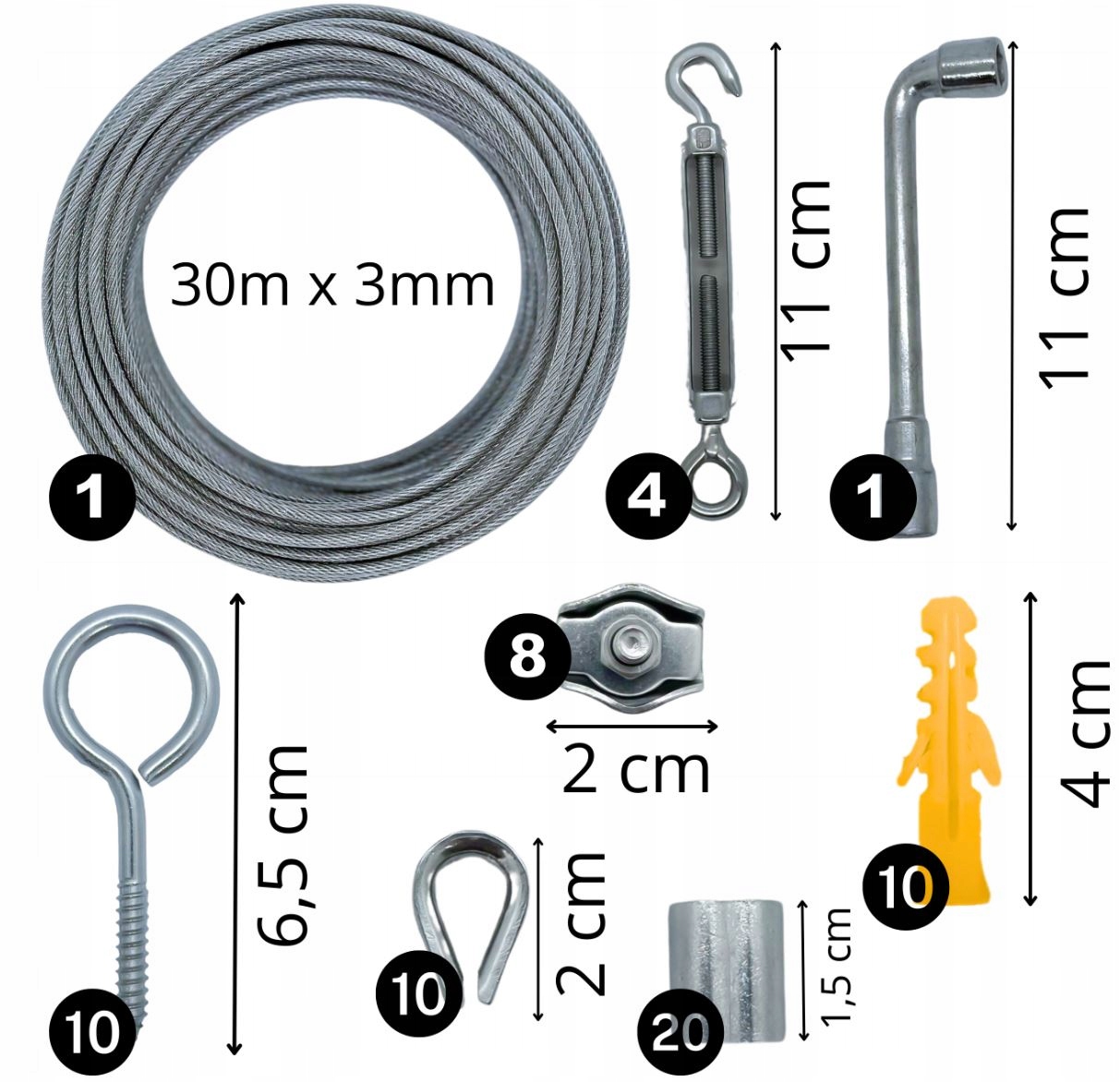 ▶ ВСЕ, ЩО ВАМ ПОТРІБНО - У набір входить не тільки сталевий трос, а й натягувачі, гаки, вушка, затискачі та шпильки - готові до негайного встановлення без необхідності використання придбання додаткових елементів.