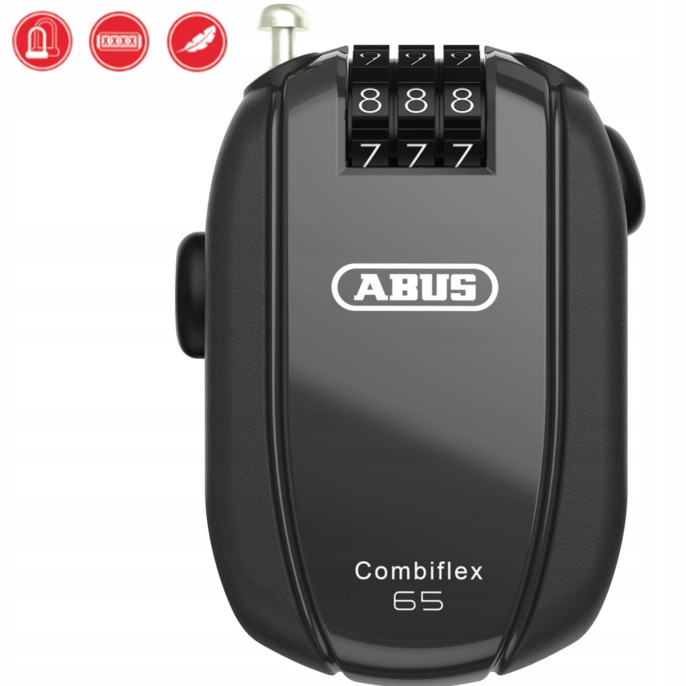 Abus Combiflex Stop Over 65 - спеціальний замок компактних розмірів. Механізм із висувною мотузкою дозволяє прикріпити до велосипеда такі предмети, як шолом або сам велосипед, коли ви хочете на хвилинку піти в магазин, щоб купити води чи перекусити, і не хвилюватися про випадкову крадіжку під час неуважність. Кодовий замок дозволяє налаштувати будь-яку тризначну комбінацію. Кабель довжиною 65 см автоматично згортається в зручний корпус, який не займає багато місця та зручний для транспортування.