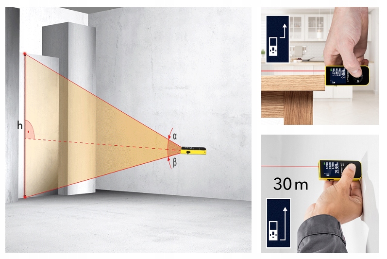 дозволяє йому точні вимірювання відстані, поверхні та об'єму, включати додаткове обладнання та корисні функції. Додаткова перевага також проста та інтуїтивна послуга. Цей вимірювальний пристрій також дуже компактний і легко вписується в кишеню штанів або сорочки. Пристрій має функцію автоматичного вимикання лазера через 30 секунд. Весь джерело живлення вимкнеться через 3 хвилини. Кришка міцна і стійка до пилу та обприскування водою і відповідає вимогам класу захисту IP54. >