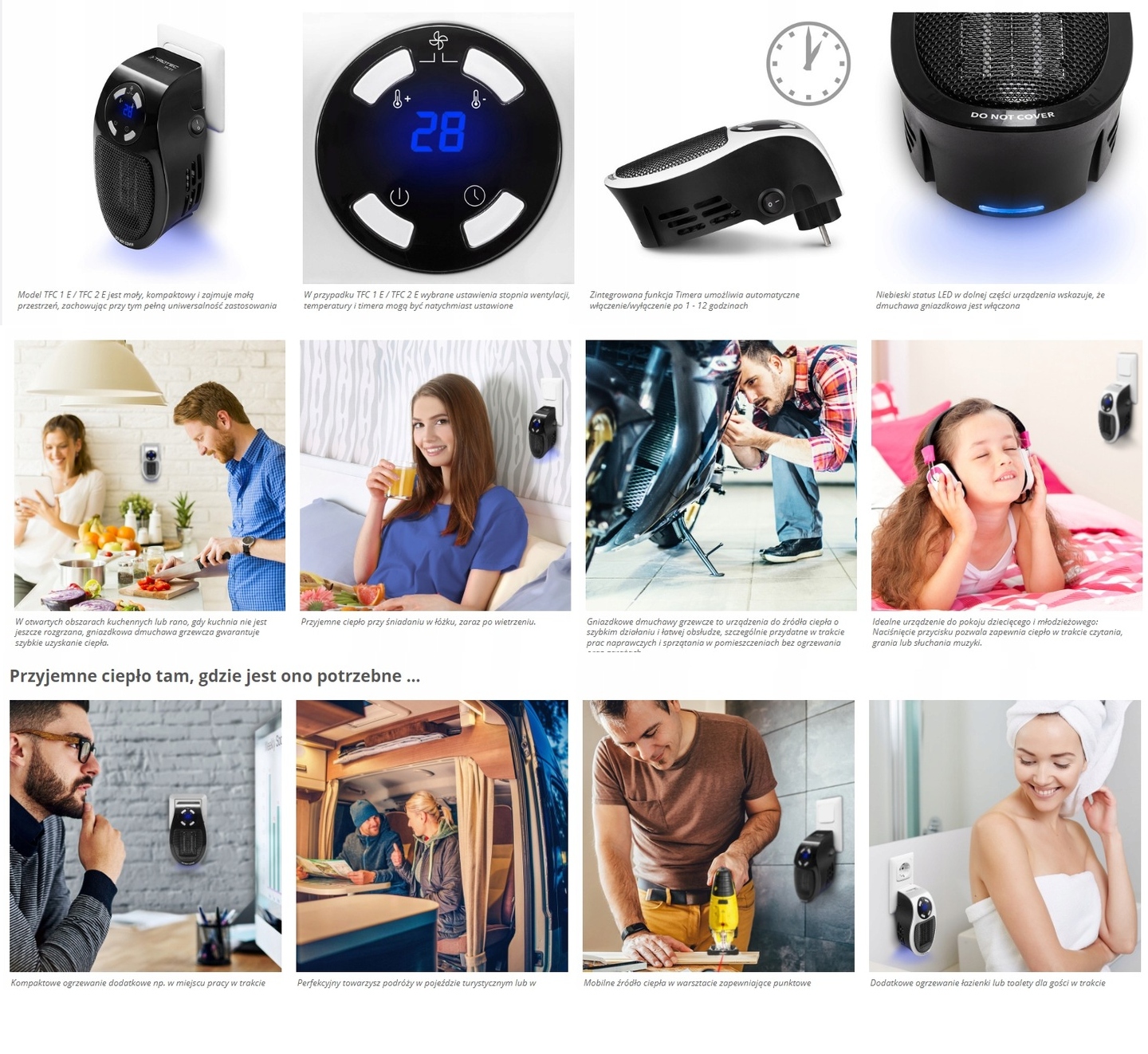 Користуватися розетковим нагрівачем дуже просто: просто вставте пристрій у розетку, увімкніть і налаштуйте необхідну температуру в діапазоні від 15 до 30 °C за допомогою термостата зі світлодіодним дисплеєм. Тепло з'являється негайно, якщо необхідно, у точно визначений час, який встановлюється за допомогою 12-годинного таймера. Це ідеальна функція, наприклад, для обігріву спальні без постійного ввімкнення вентилятора опалення. Ці моделі оснащені енергоефективною функцією автоматичного відключення, коли досягається цільове значення.