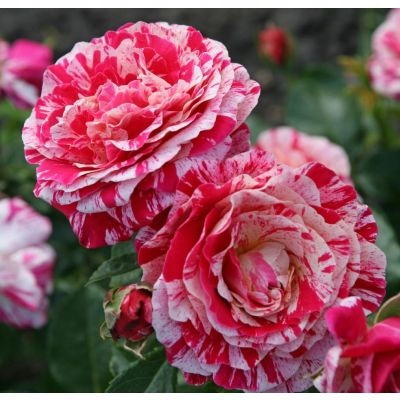 PAPAGENO (MCGREDY, 1989) Великі квіти оригінального забарвлення, нерівномірно пофарбовані, визначають велику привабливість і красу цієї троянди; високі, компактні кущі ростуть досить сильно.Чайний гібрид з красивими великими малиново-червоними квітками з білими смугами. Дуже привабливий кущ в саду. Поєднання кольорів точнісінько як у польського прапора. Кущ виростає до 70 см. Квітки зібрані по кілька в групу і рясно цвітуть протягом усього літа. Ідеальна пропозиція для людей, які шукають нові, цікаві кольорові композиції для свого саду. Застосування: для клумб і рабаток, в садах, на зрізку.