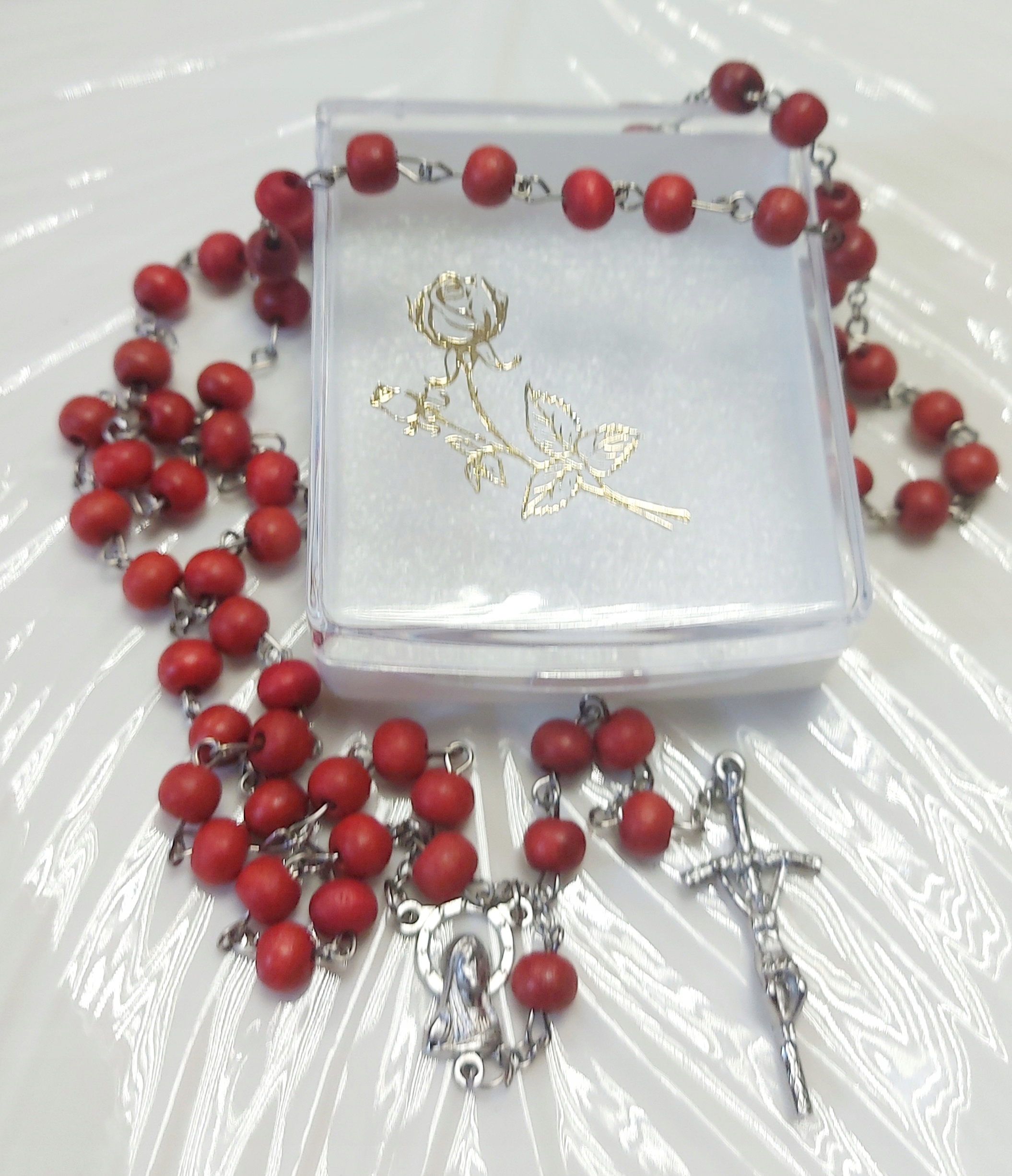 Традиційні чотки з дерев’яних запашних намистин, з’єднаних металевими з’єднувачами, упаковані в прозору коробку із зображенням Святого.