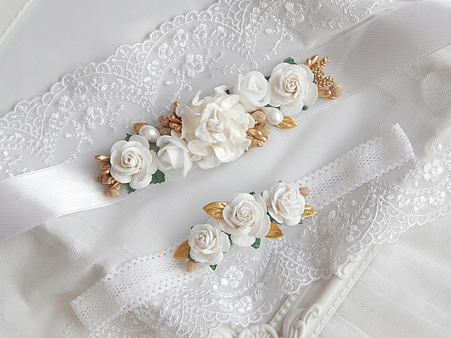 пов'язка на голову на декоративній білій еластичній, прикрашеній ніжними квітами. Його схема в незаконному стані становить близько 36 см