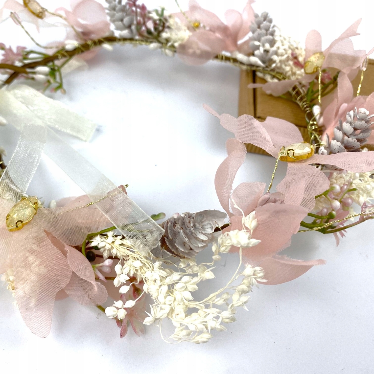 Плетений вінок залишився на природних гілочках. Для його виготовлення використана фурнітура найвищої якості. У віночку присутні як штучні квіти, так і справжні квіти, висушені методом сублімації, тому квіти виглядають натурально. Крім того, у вінок вплетені шифонові метелики з мерехтінням > кристали. Все це виглядає феноменально.