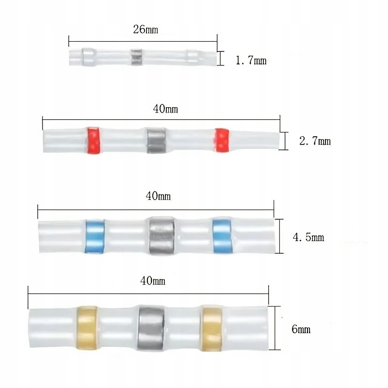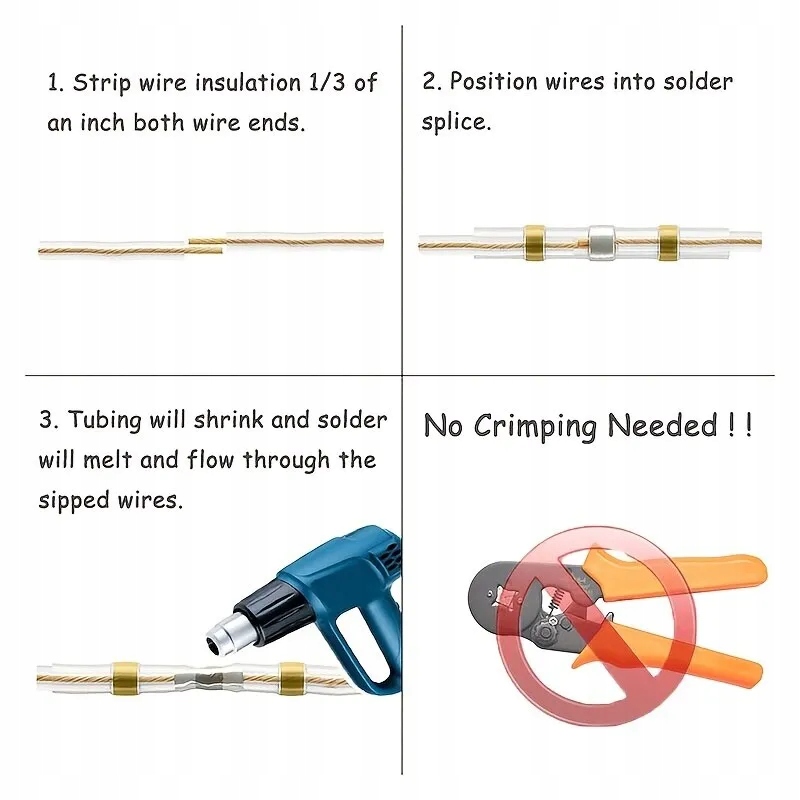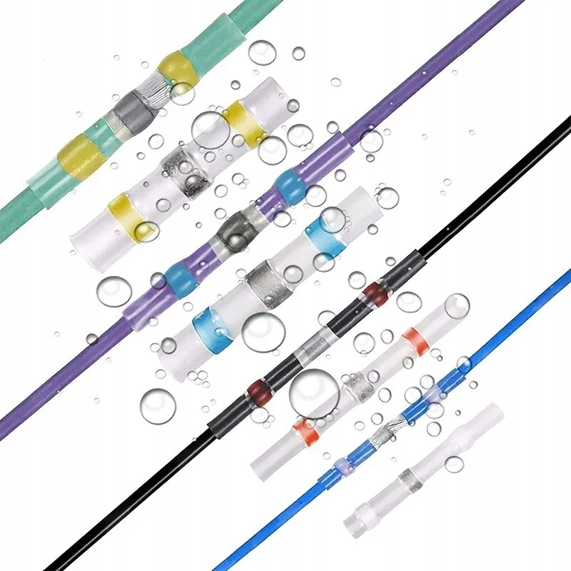 Термоусадочні трубки з жерстю для з'єднання електричних проводів. Набір для ремонту та підключення кабелів. Всередині трубки є шар клею (білий), який зміцнює і захищає з'єднання від вологи, і олова (сріблясто-сірий), який відповідає за постійне з'єднання проводів. Футболки мають високу стійкість до розтягування та механічних пошкоджень.