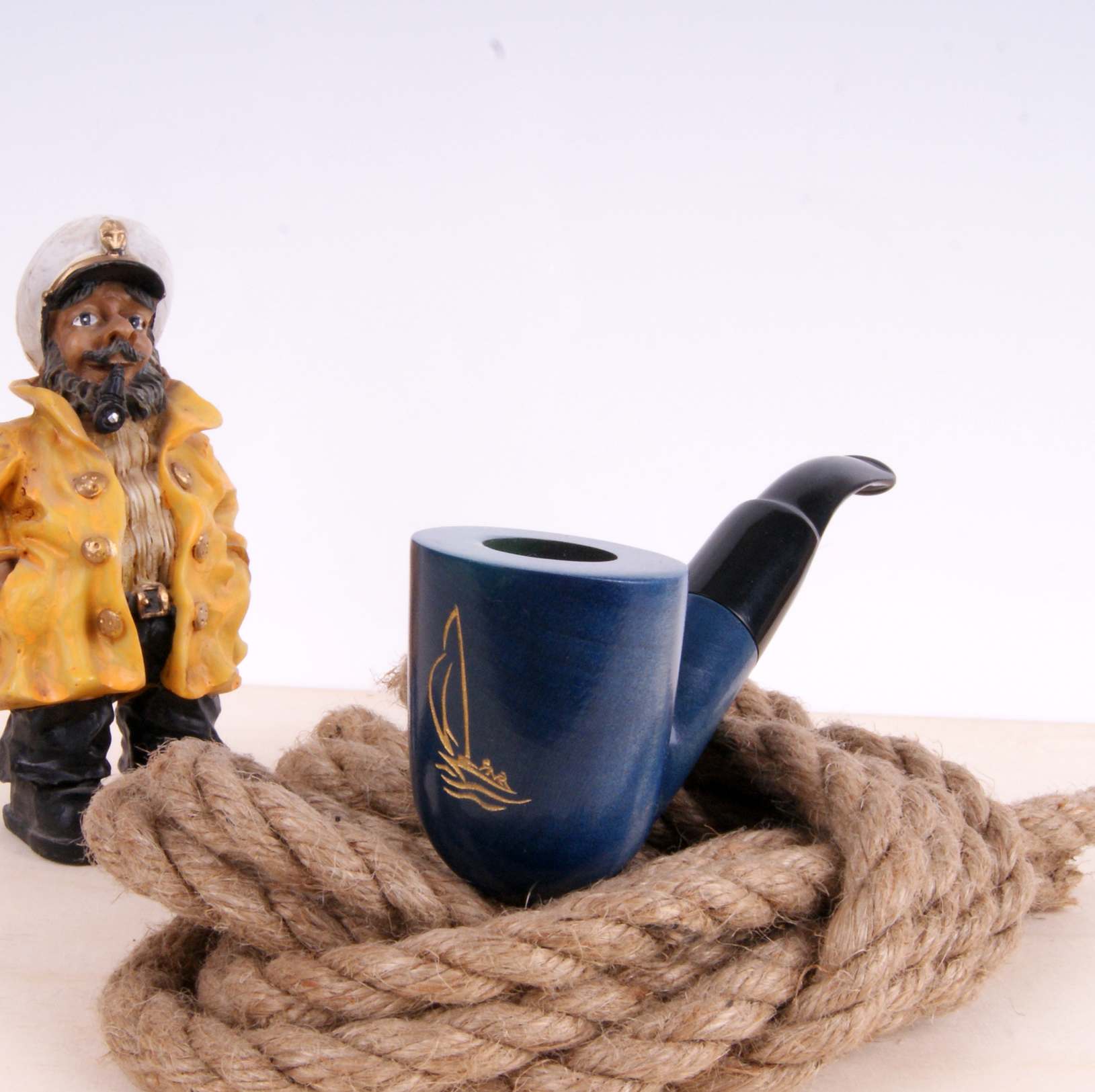 Акуратна люлька цікавої форми, ручної роботи зі старовинного польського дерева груші. Мотиви, розміщені на синій голові, відносяться до морського і вітрильного клімату, адже запалена люлька є атрибутом багатьох капітанів. На вибір два візерунки. Камера згоряння має стандартний об'єм і захищена прекарбонатом. Злегка вигнутий мундштук має місце для 9-мм фільтра. Трубка упакована в призначену для нашої студії коробку.